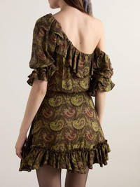 One-shoulder ruffled paisley-print georgette mini dress Brown