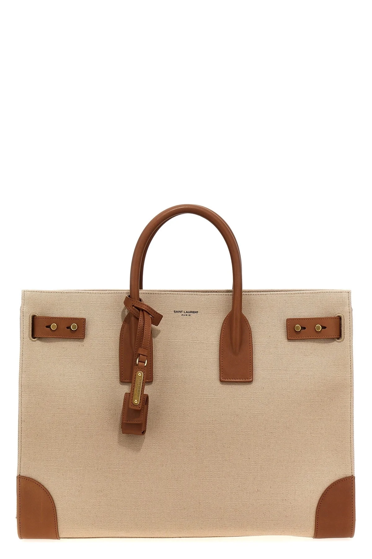cod. 781934FAC7T9856 'Sac De Jour' large canvas and leather handbag, double leather handle, adjustable and removable shoulder strap, removable clutch, brass padlock. Color: Beige Size & Fit: W 40 x H 30 x D 13.5 cm Composition: 100% cotton
