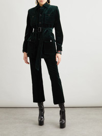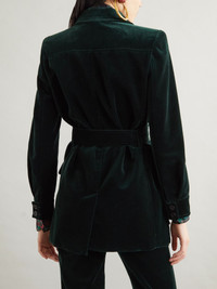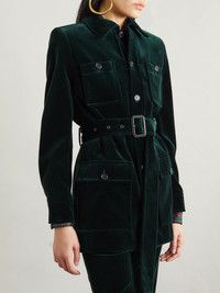 Anthony Vaccarello's work at SAINT LAURENT is the perfect balance between masculine and feminine. This jacket is cut from plush velvet in a structured, safari-style profile, which was also a favorite of founder Yves. It was shot in the Pre-Fall '25 lookbook with the matching pants and platform boots. Size & Fit - Fits true to size, take your normal size - Designed for a slightly loose fit, use the tie belt to cinch in at the waist - Mid-weight, non-stretchy fabric - Model is 180cm/ 5'11" and is wearing a FR 36 Model measurements: - Bust: 79cm/ 31" - Waist: 60cm/ 23.5" - Hip: 86cm/ 34" Details & Care - Dark-green velvet - Button fastenings through front - 65% viscose, 35% cupro - Dry clean