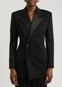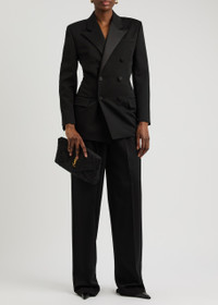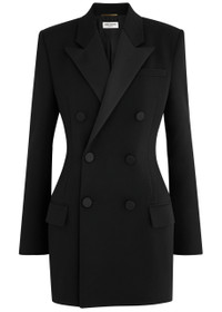 Info & Care Saint Laurent wool blazer Notched lapels, silk lapels, padded shoulders, button-fastening cuffs, chest slit pocket, darted waist, front flap pockets, two internal slip pockets, fully lined Double-breasted button fastenings at front Fabric 1: 100% wool; fabric 2: 100% silk; lining: 100% silk Dry clean Size & Fit Length shoulder to hem: 29.5 inches/ 75cm Midweight Regular fit, slim across the waist Model is 5'10"/ 178cm and wears a size FR36