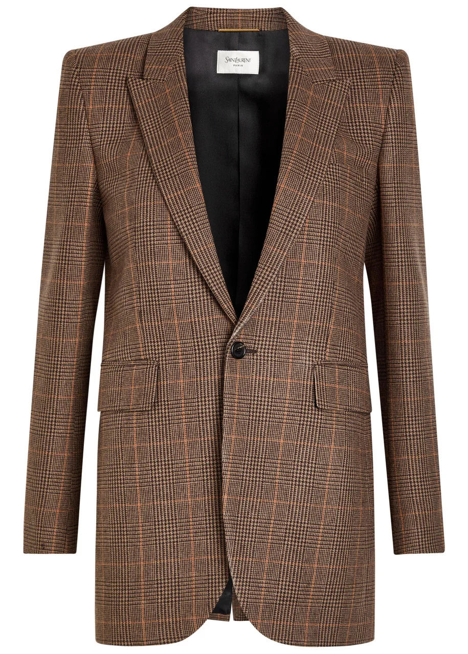 Info & Care Saint Laurent wool and cashmere-blend blazer Houndstooth intarsia, peaked lapels, padded shoulders, faux button-fastening cuffs, chest slit pocket, front flap pocket, back vent, two internal slit pockets, fully lined Button fastening at front; 90% wool, 10% cashmere; lining: 100% silk Dry clean Size & Fit Length shoulder to hem: 29 inches/ 73.5cm Midweight Regular fit Model is 5'9"/ 175cm and wears a size;FR36