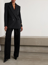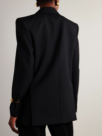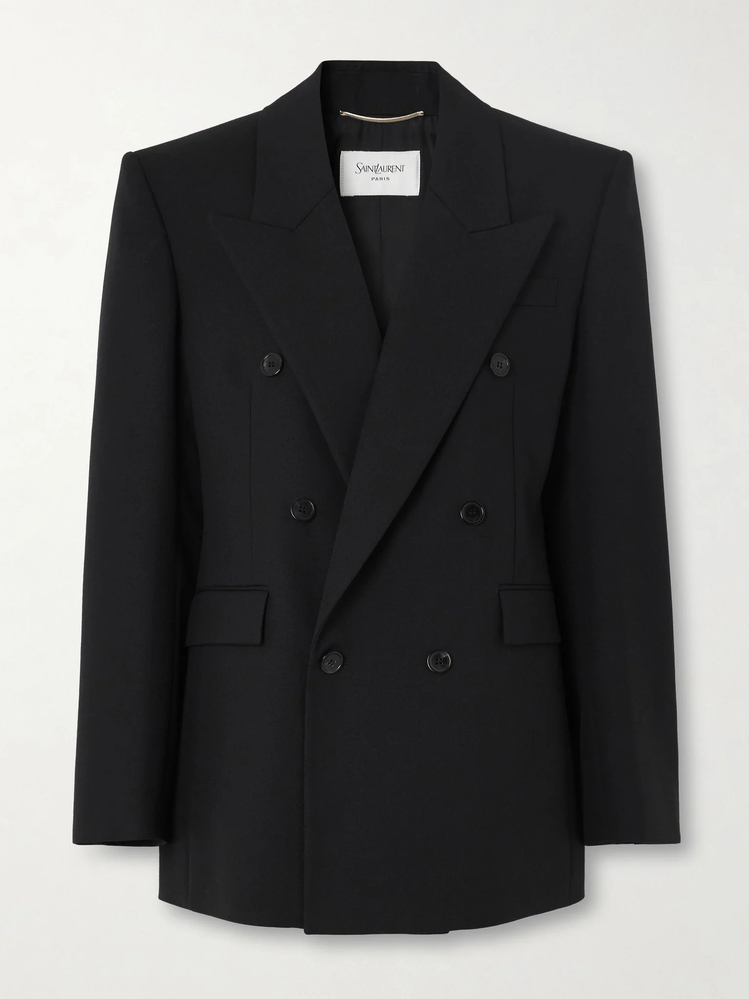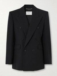 SAINT LAURENT's blazer is inspired by Yves Saint Laurent's personal uniform. Cut from structured grain de poudre wool, it has a boxy, double-breasted profile with sharply padded shoulders and peak lapels. It's lined in silk for effortless layering. Size & Fit - Fits true to size, take your normal size - Tailored for a slightly loose fit - Internal shoulder pads - Mid-weight, non-stretchy fabric - Model is 180cm/ 5'11" and is wearing a FR 36 Model measurements: - Bust: 75cm/ 29.5" - Waist: 60.5cm/ 24" - Hip: 88.5cm/ 35" Details & Care - Black grain de poudre wool - Button fastenings through double-breasted front - 100% wool; lining: 100% silk - Dry clean