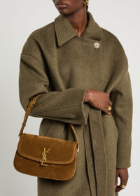 Info & Care Saint Laurent suede shoulder bag Adjustable buckle-fastening shoulder strap, magnetic-fastening back slip pocket, internal card slot, leather lining Logo plaque at turn-lock fastening Size & Fit Width: 9.5 inches/ 24cm Height: 6.5 inches/ 16.5cm Depth: 3 inches/ 7.5cm Min. shoulder strap drop: 7 inches/ 17.5cm Max. shoulder strap drop: 9.5 inches/ 24cm