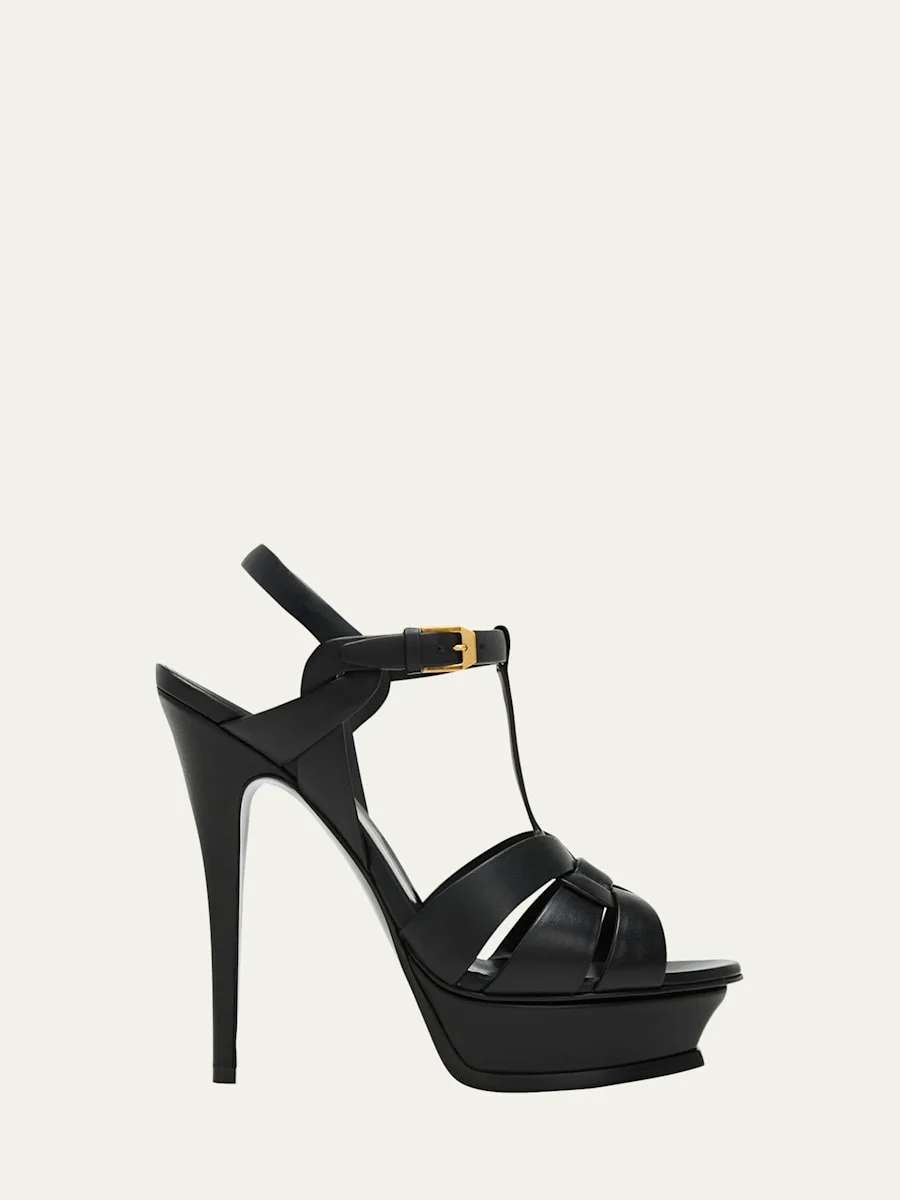 Saint Laurent interwoven leather sandal. T-bar front and oversized platform ensure they exude a 1970s-meets-modern-day aura, no matter what you pair them with. 4.1" covered stiletto heel; 1.2" platform; 3.1" equiv. Tapered straps band open toe. T-strap vamp. Adjustable ankle strap. Leather lining and sole. Online Inquiries: BGS21_X3VN6| Store Inquiries: #2180927