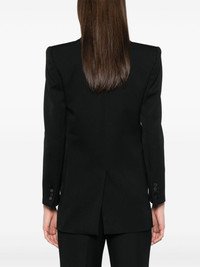 tuxedo blazer Highlights - Black - Wool - Satin trim - Front button fastening - Peak lapels - Shoulder pads - Long sleeves - Faux buttoned cuffs - Chest welt pocket - Two front flap pockets - American rear vent - Silk lining Made in Italy Composition Outer: Polyester 100%, Wool 100% Lining: Silk 100%, Cotton 97%, Elastane 3% SIZE & FIT Model measurements Height 5 ft 10 in(1.78 m) Bust/Chest 33.85 in(86 cm) Hips 36.61 in(93 cm) Waist 26.77 in(68 cm) FittingInformation Designed for a slim fit that sits just away from the body offering a close yet comfortable fit The vented hem offers movement at the rear Made from a midweight non-stretch fabric Washing instructions Dry Clean Only