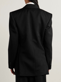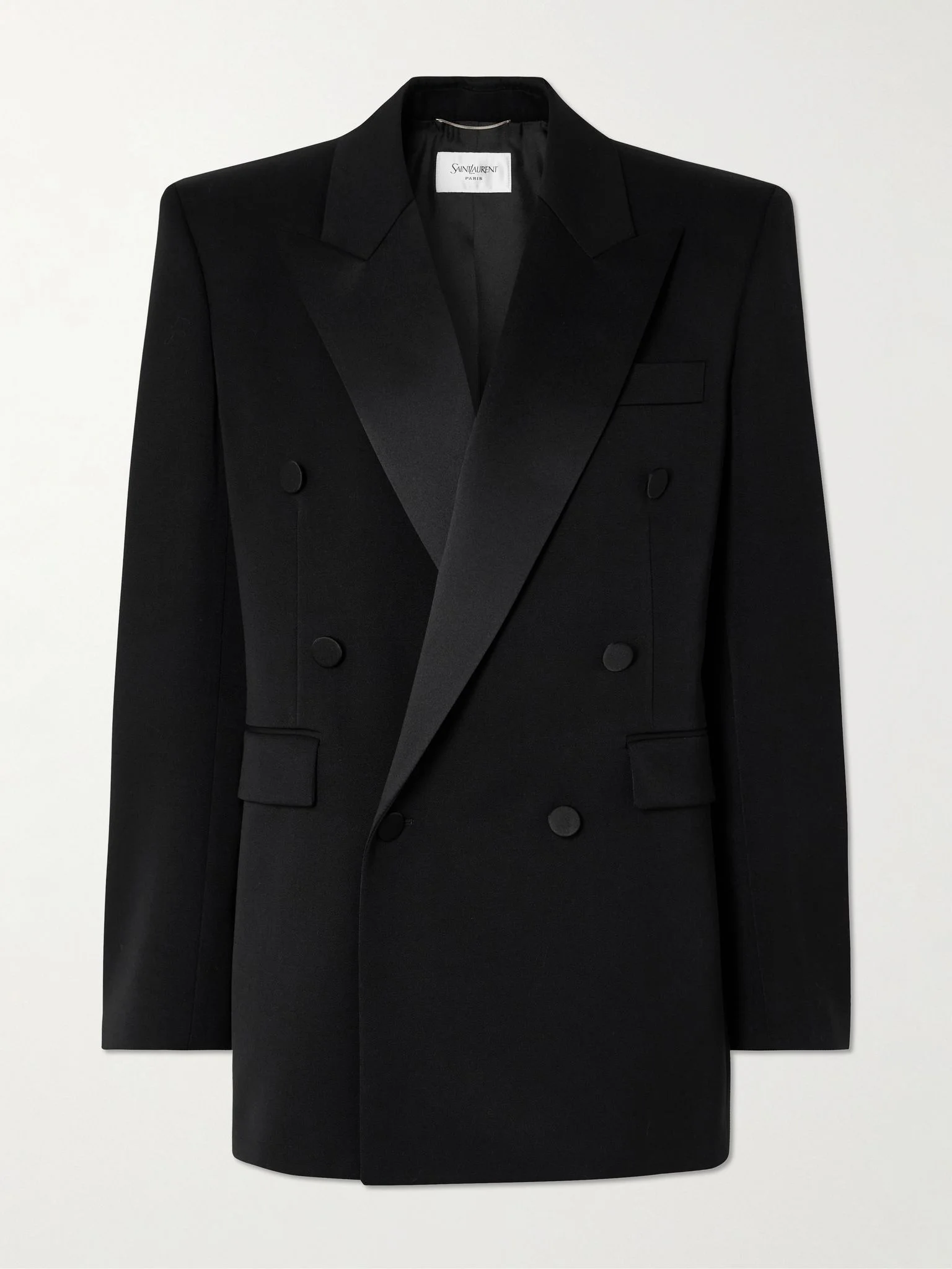 Bella Hadid wore this blazer in SAINT LAURENT's Spring '25 show. Inspired by the founder's personal style, it resembles traditional tuxedos with satin peak lapels and a double-breasted front. It's tailored from wool in oversized proportions, which worked so well with wide pants on the runway. Size & Fit - Fits true to size, take your normal size - Tailored for a loose fit - Internal shoulder pads - Mid-weight, non-stretchy fabric - Model is 180cm/ 5'11" and is wearing a FR 36 Details & Care - Black wool and satin - Button fastenings through double-breasted front - 100% wool; trim: 100% polyester; lining1: 100% silk; lining2: 97% cotton, 3% elastane - Dry clean