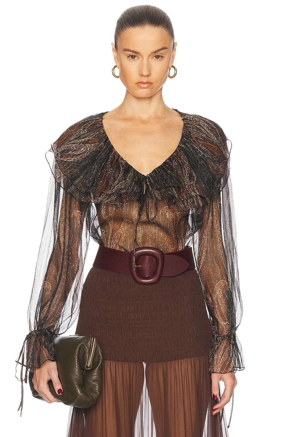 Details - 95% silk, 5% metallized fiber - Made in Italy - Dry clean only - Pull-on styling - Tie-up detail at neckline and cuffs - Sheer gauze fabric with metallic threading - Garment is intentionally sheer, undergarments will show through. - Please note undergarment not included - This item is not available to ship to Indonesia - Our Style No. SLAU-WS442 - Manufacturer Style No. 819882-Y3K61-4052