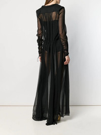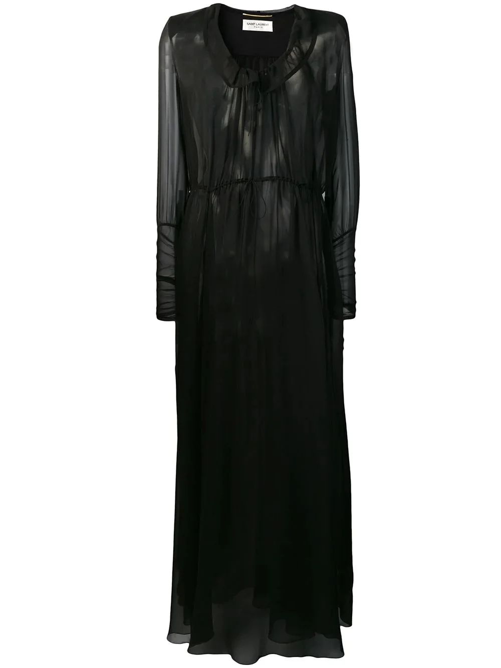 sheer maxi dress Founded in 1961 by innovative designer Yves Saint Laurent, French luxury fashion house Saint Laurent fuses expert craftsmanship with the label’s signature rock ‘n’ roll flair, as showcased by this black silk sheer maxi dress. Featuring a ruffled neck, long sleeves, a flared style and drawstring details at the neck, waist and cuffs. Made in France Composition Lining: Silk 100% Outer: Silk 100% SIZE & FIT Model measurements Height 5 ft 10 in(1.78 m) Bust/Chest 33.07 in(84 cm) Hips 35.82 in(91 cm) Waist 26.96 in(68.5 cm) Washing instructions Dry Clean Only