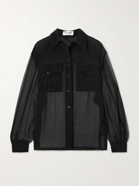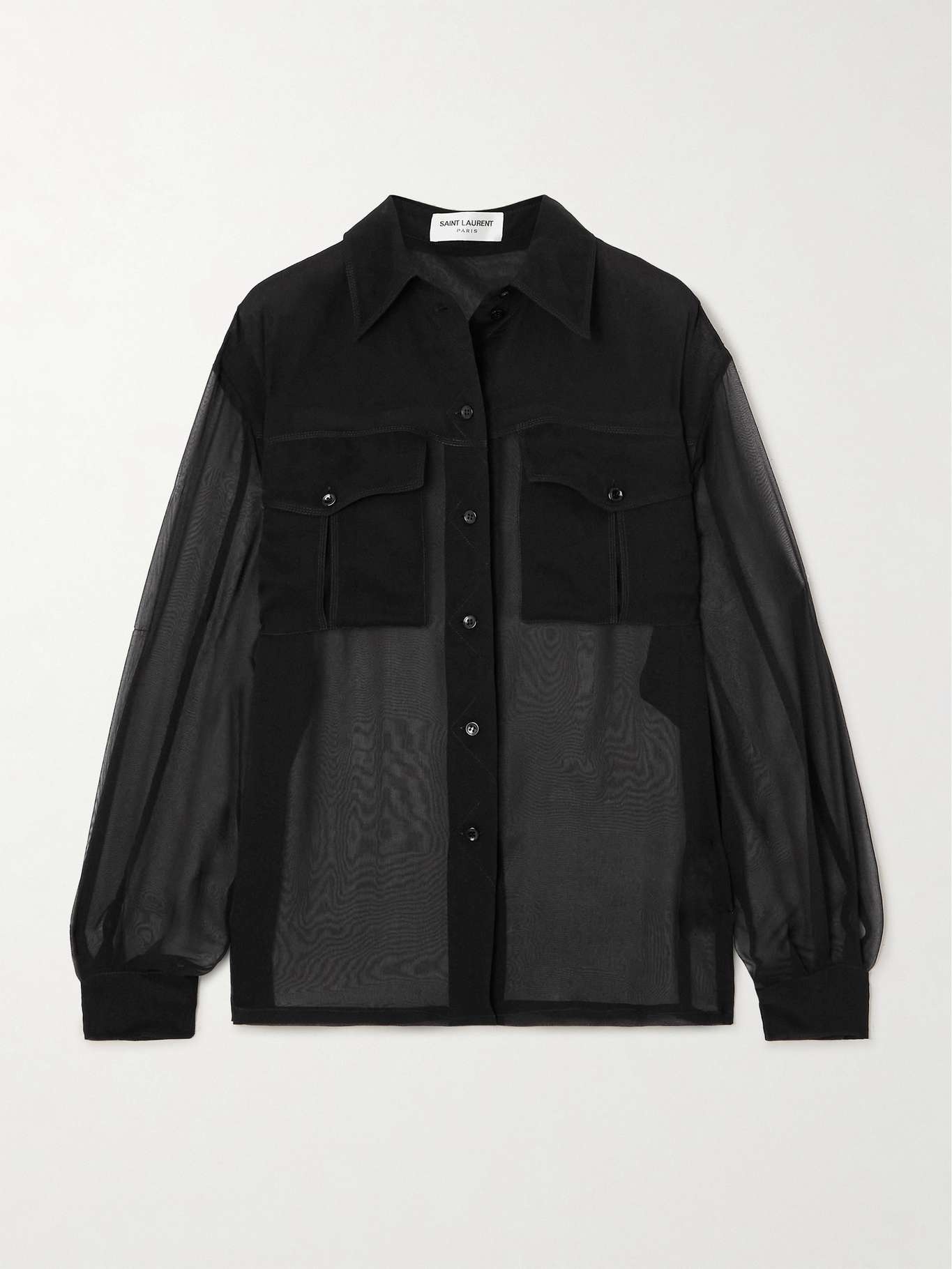EDITORS'NOTES SAINT LAURENT's shirt is made from fluid, semi-sheer silk-chiffon that's tempered by an opaque yoke and utility pockets. It's designed for a slightly loose fit and has a neat collar and buttoned cuffs. Underpin yours with a triangle bra and tuck it into tailoring or jeans. SIZE & FIT Model measurements: - Fits true to size, take your normal size - Designed for a slightly loose fit - Lightweight, non-stretchy fabric - Model is 177cm/ 5'10" and is wearing a FR 36 - Bust: 82cm/ 32.3" - Waist: 66cm/ 26" - Hip: 90cm/ 35.4" DETAILS & CARE - Black silk-chiffon - Button fastenings through front - 100% silk - Dry clean