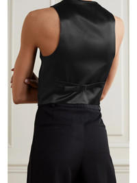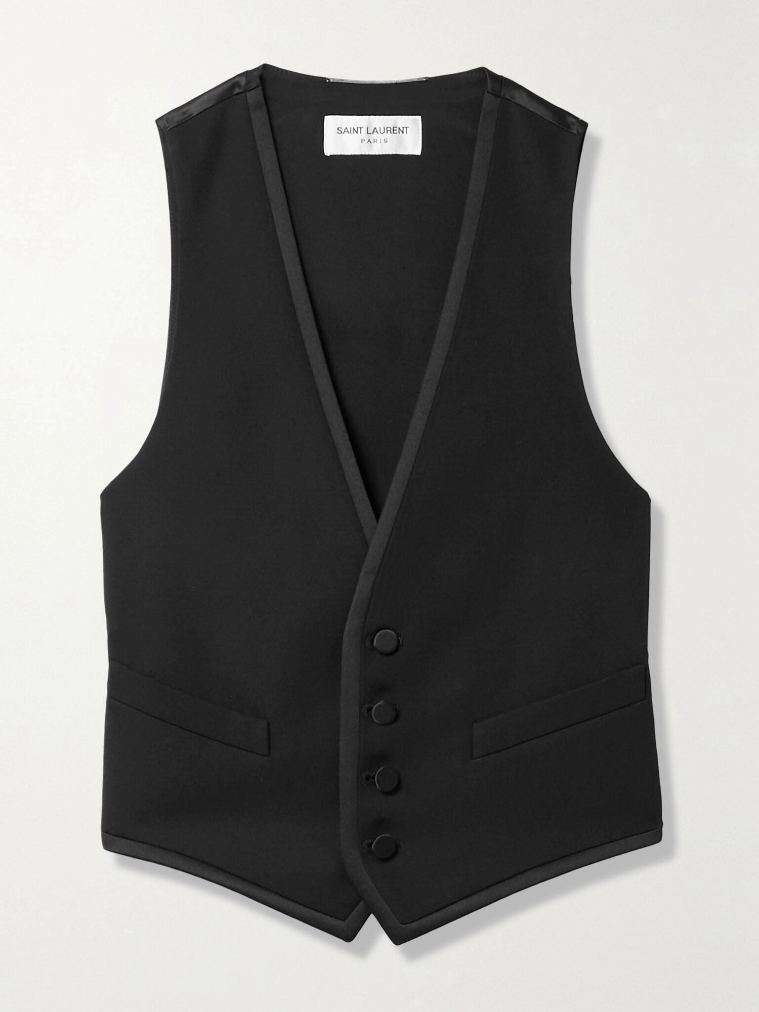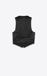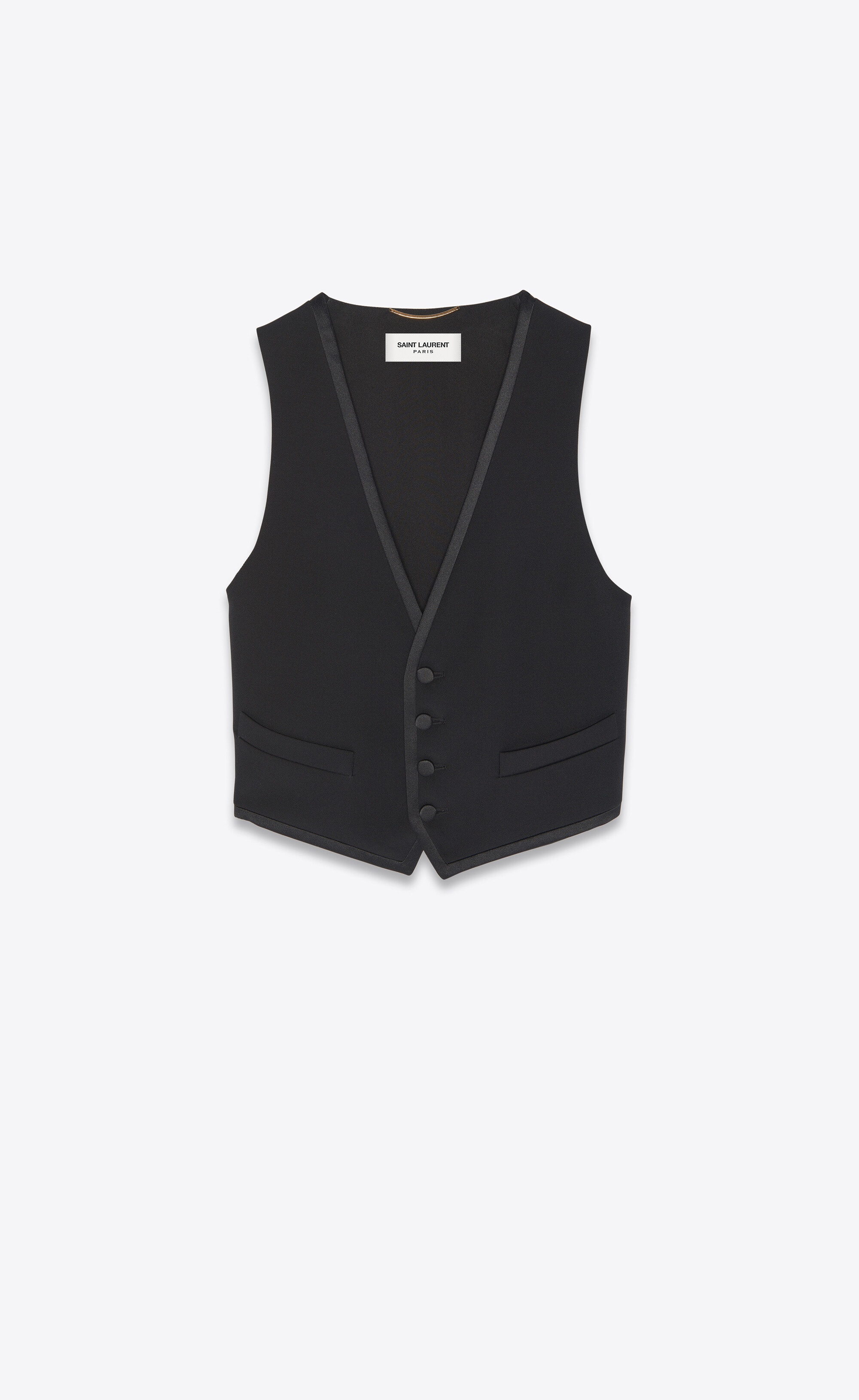 SHORT TUXEDO VEST MADE WITH RESPONSIBLE WOOL WITH SATIN TRIM, SATIN-COVERED BUTTONS AND AN ADJUSTABLE SLIDING BELT AT THE BACK. - 100% VIRGIN WOOL - RESPONSIBLE WOOL - SILK AND ELASTANE LINING - FRONT BUTTON CLOSURE - TWO WELT POCKETS AT THE FRONT - STRAIGHT NECK - ADJUSTABLE SLIDING BELT AT THE BACK - STYLE ID 647510Y512W1000 - MADE IN ITALY