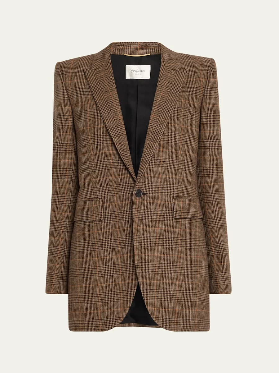 Saint Laurent blazer jacket is crafted from a wool-cashmere blend with a houndstooth plaid motif Peak lapels; single-breasted front Long sleeves; button cuffs Chest welt pocket Hip flap pockets Slim straight fit Hem falls below the hip Cutaway hem Wool/cashmere Made in Italy Online Inquiries: BGS21_BA8XD| Store Inquiries: #5056014