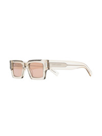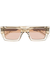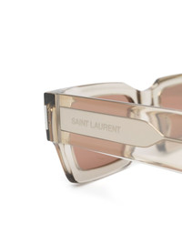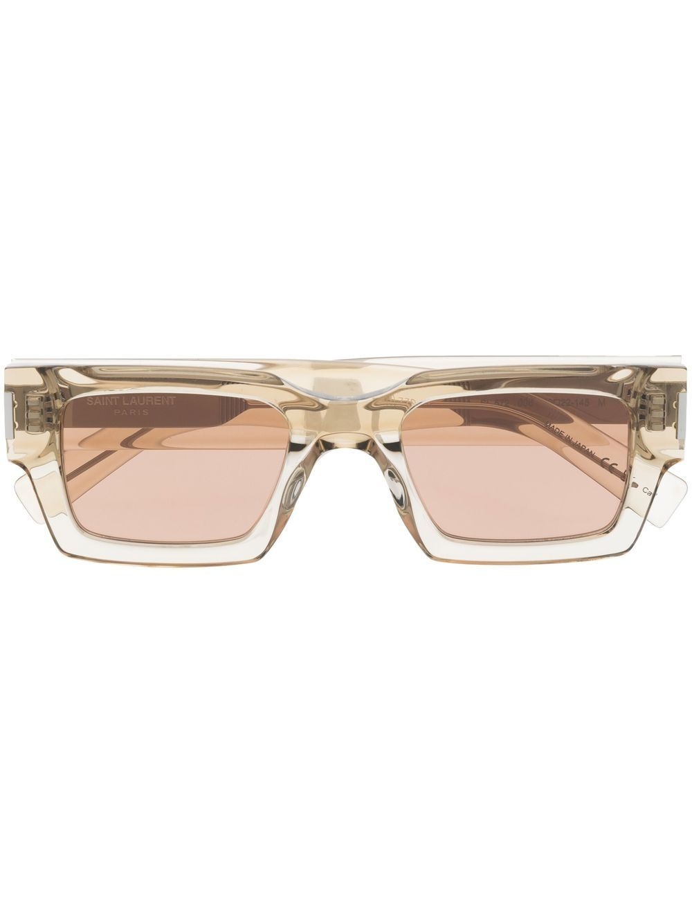 square-frame tinted sunglasses square-frame tinted sunglasses from SAINT LAURENT EYEWEAR featuring light beige, square frame, brown tinted lenses, transparent design, engraved logo, nose pads, straight arms, curved tips and UV-protective lenses. These glasses come with a protective case.. Imported Composition Acetate 100% SIZE & FIT Measurement Arm Length 5.7 in(14.5 cm) Bridge Width 0.9 in(2 cm) Lens Diameter 2 in(5 cm) Total Width 5.6 in(14.5 cm)