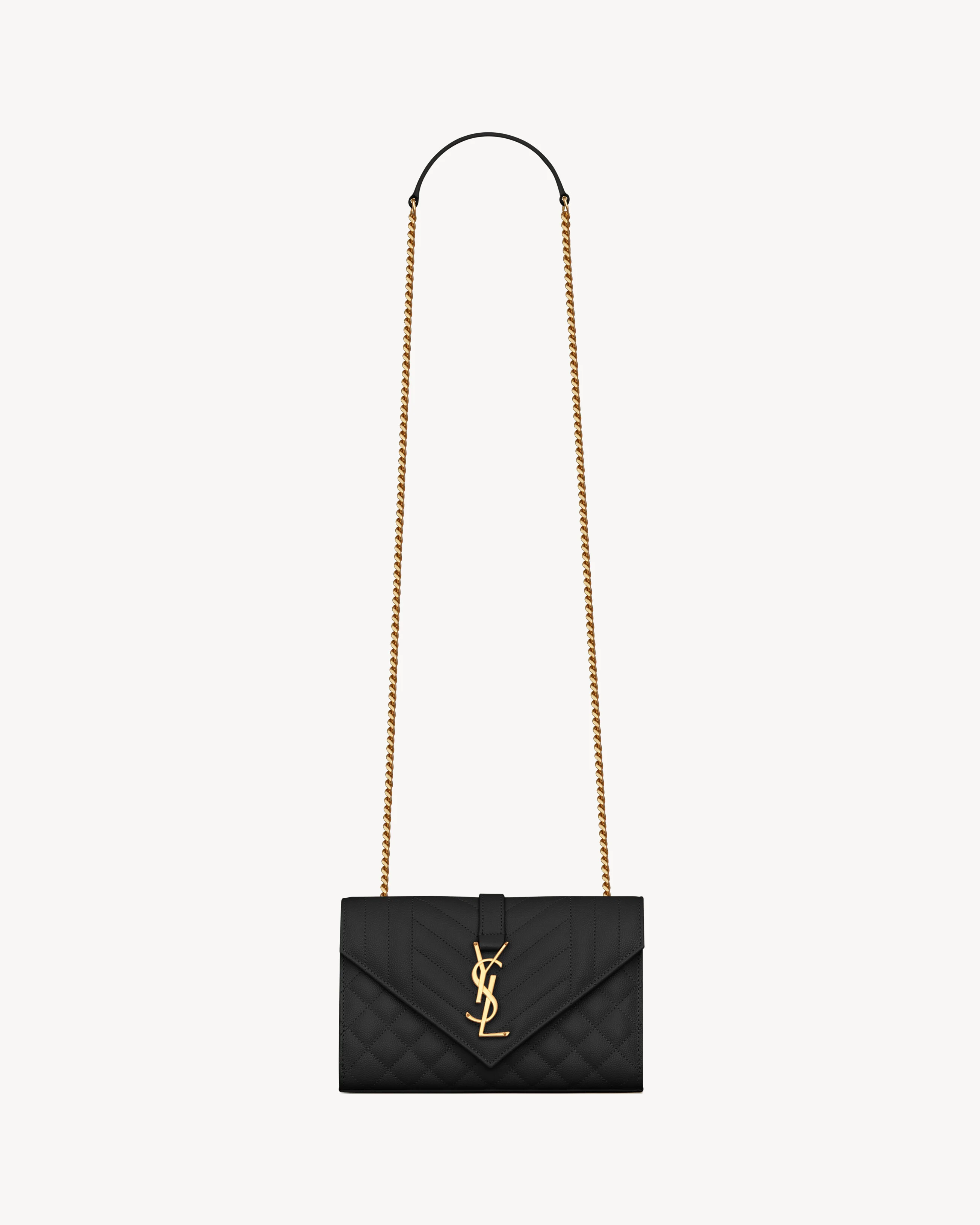 ENVELOPE FLAP BAG IN GRAIN DE POUDRE EMBOSSED LEATHER, FEATURING CHEVRON AND DIAMOND QUILT OVERSTITCHING. LIGHT, WITH A LONG CHAIN SHOULDER STRAP TO GO FROM DAY TO NIGHT. - CHROME AND METAL-FREE TANNED LEATHER - GROSGRAIN LINING - GOLD-TONED HARDWARE - ONE EXTERIOR BACK POCKET - MAGNETIC SNAP TAB - ONE INTERIOR SLOT POCKET - DIMENSIONS: 8.2 X 5.1 X 2.3 INCHES - CHAIN LENGTH: 21.6 INCHES - CALFSKIN LEATHER - STYLE ID 600195BOW911000 - MADE IN ITALY