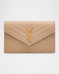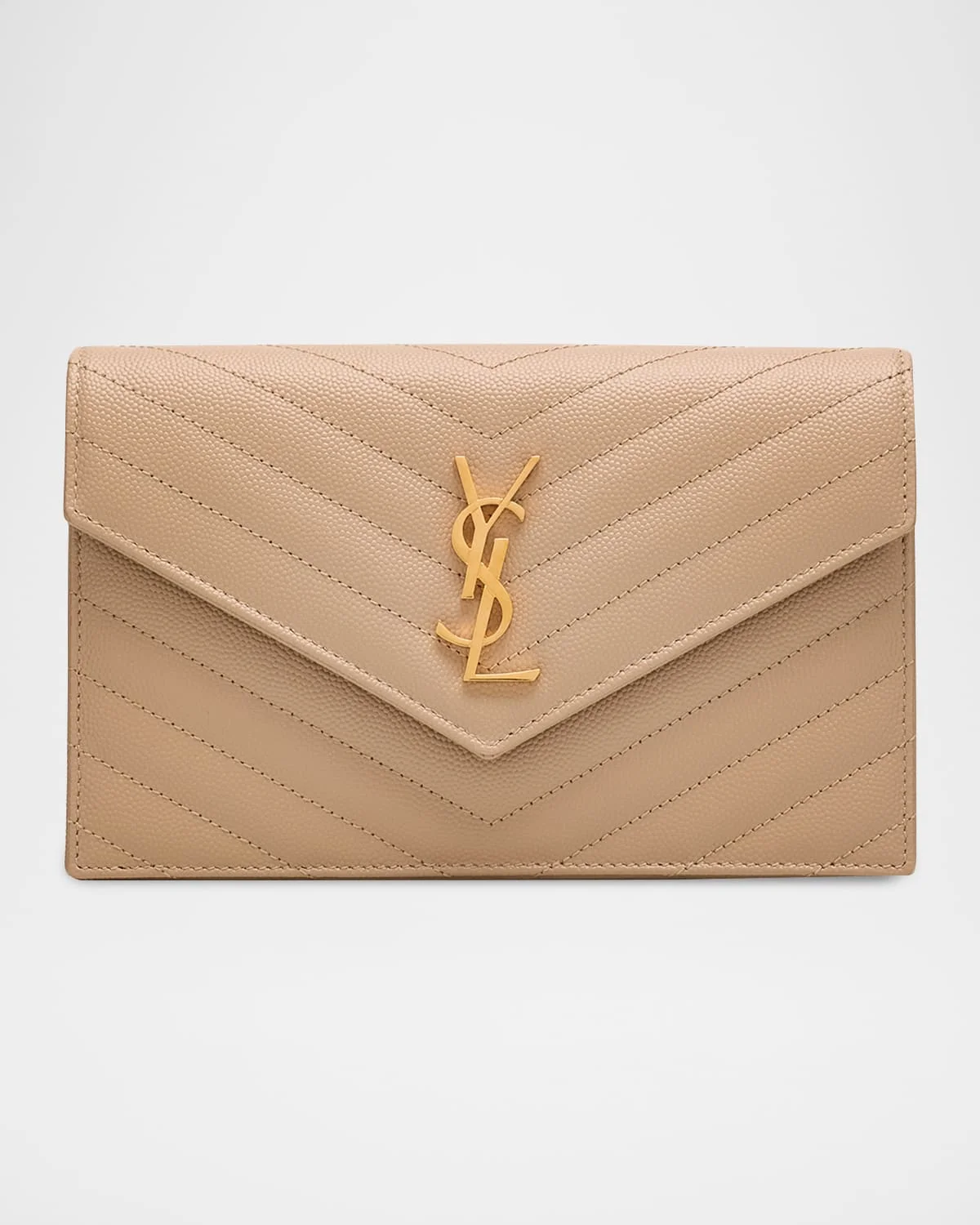 This compact Saint Laurent wallet is crafted in grain de poudre leather with iconic chevron quilting Features signature YSL logo lettering Stowable leather/chain shoulder strap, 21.7" drop Can be worn as a clutch or shoulder bag Envelope flap top with snap closure Interior, one zip pocket, one slip pocket Approx. 5"H x 7.5"W x 1.4"D Made in Italy