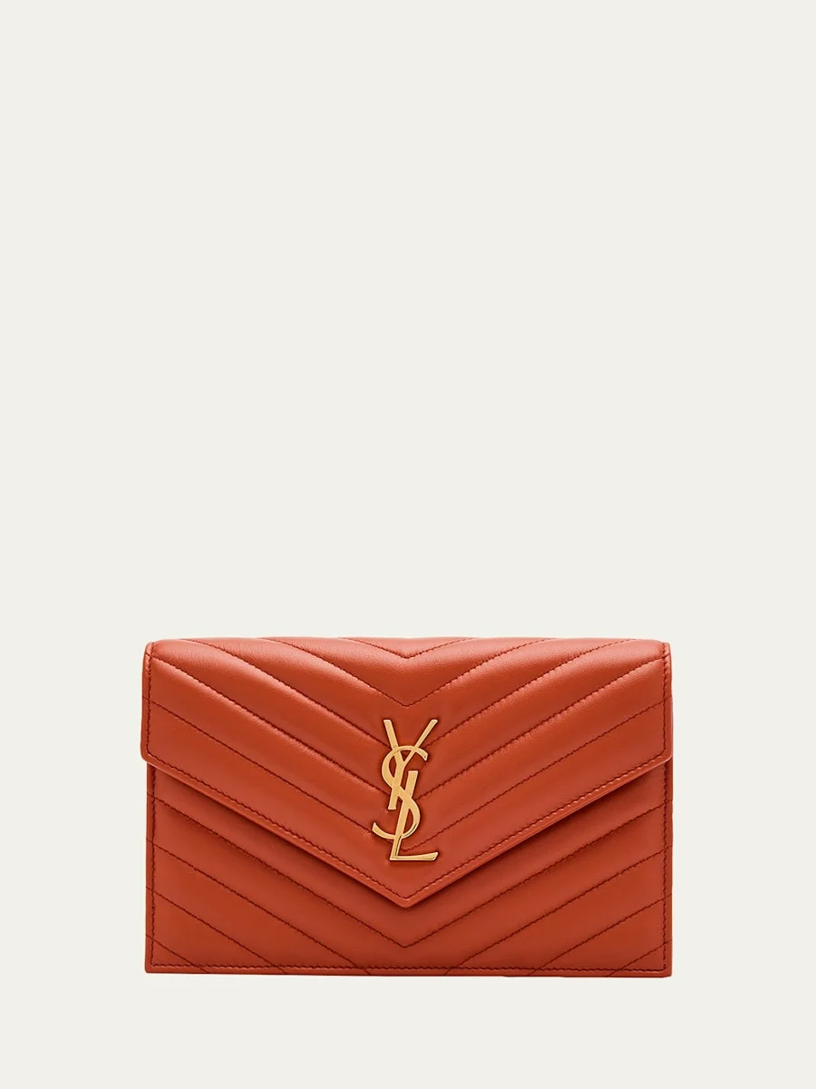 This compact Saint Laurent wallet is crafted in grain de poudre leather with iconic chevron quilting Features signature YSL logo lettering Stowable leather/chain shoulder strap, 21.7" drop Can be worn as a clutch or shoulder/crossbody bag Envelope flap top with snap closure Interior, one zip pocket, one slip pocket Approx. 5"H x 7.5"W x 1.4"D Made in Italy