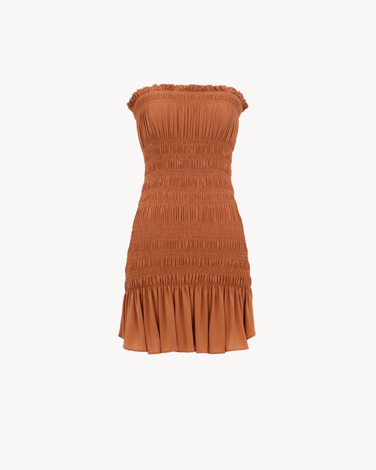 STRAPLESS GATHERED MINI DRESS MADE WITH CERTIFIED VISCOSE, FEATURING SMOCKED STRIPES AND A RUFFLED DROP-WAIST SKIRT. - CERTIFIED VISCOSE - VISCOSE AND ELASTANE LINING - STRAPLESS NECKLINE - 94% VISCOSE, 6% ELASTAN - STYLE ID 819031Y37LF6689 - MADE IN FRANCE