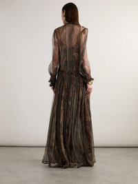 SAINT LAURENT's dress looks like a rare archival find from the '80s. Made from silk-blend chiffon, it's smocked at the waist and framed with flowing pussy-bow ties. The paisley pattern is flecked with sparkling metallic threads. Size & Fit - Fits true to size, however those who are between sizes should take the smaller size - Cut for a slightly loose fit - Lightweight, semi-sheer, non-stretchy fabric - Model is 177cm/ 5'10" and is wearing a FR 34 Model measurements: - Bust: 81cm/ 32" - Waist: 62cm/ 24.5" - Hip: 89cm/ 35" Details & Care - Multicolored metallic silk-blend chiffon - Button fastenings through front - 95% silk, 5% metallic fibers - Dry clean