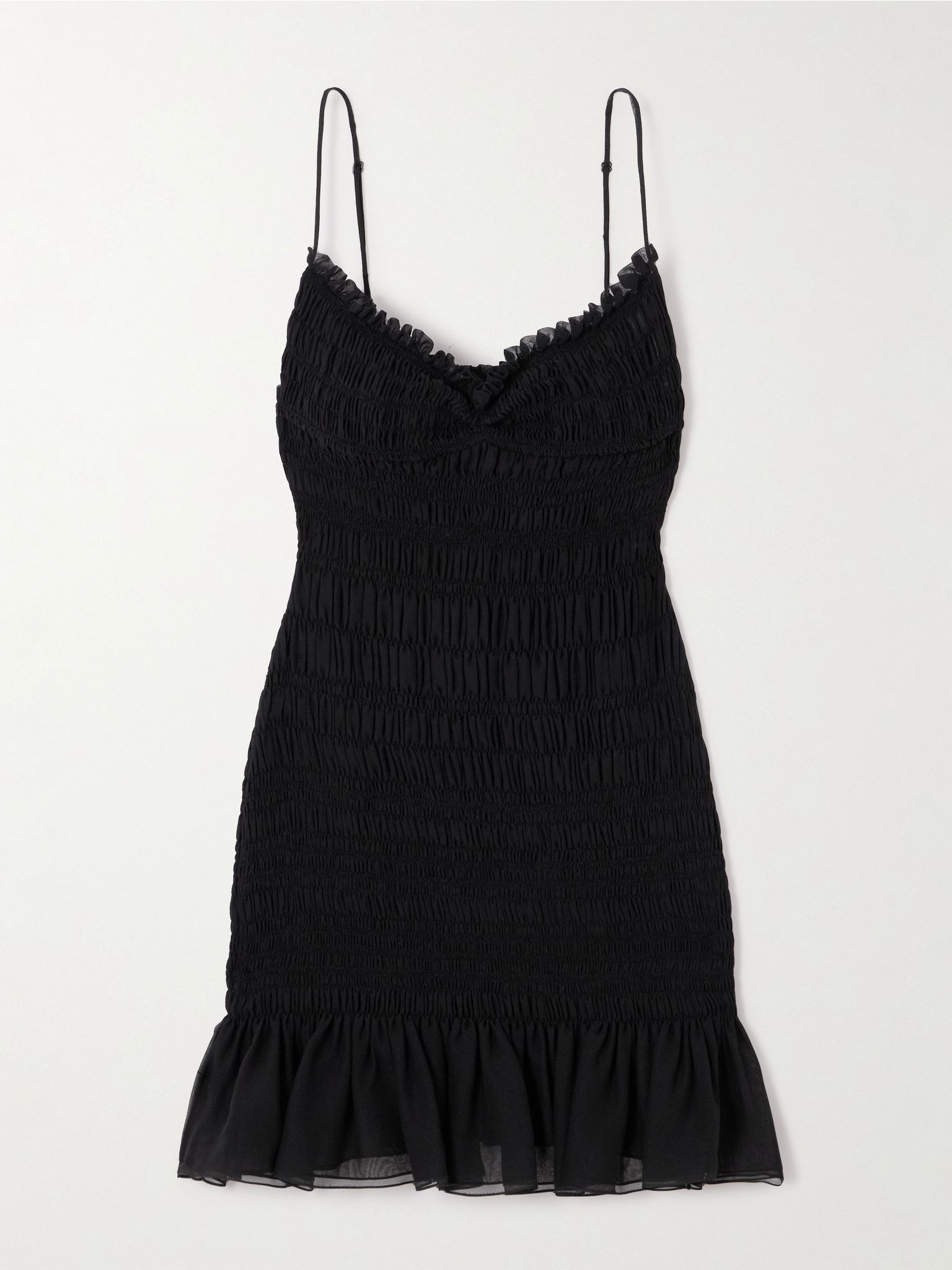 SAINT LAURENT's LBD is made from silk-crepon that's delicately smocked through the body to highlight your figure. It's suspended from pin-thin straps and traced with ruffles along the sweetheart neckline and mini hem. Size & Fit - Fits true to size, take your normal size - Designed for a close fit - Fully adjustable shoulder straps - Lightweight, stretchy fabric - Model is 177cm/ 5'10" and is wearing a FR 36 Model measurements: - Bust: 80cm/ 31.5" - Waist: 60cm/ 23.5" - Hip: 89cm/ 35" Details & Care - Black silk-crepon - Slips on - 100% silk - Dry clean