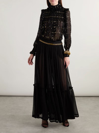 SAINT LAURENT’s blouse is designed with careful attention to every last detail. It's made from silk-blend fil coupe crepon with sparkling metallic threads and has a shirred yoke and ruffled trims, including at the high neckline and billowy sleeves. Temper the sheer finish with a tonal bralette or camisole. Size & Fit - Fits true to size, take your normal size - Designed for a relaxed fit - Lightweight, semi-sheer, non-stretchy fabric - Model is 177cm/ 5'10" and is wearing a FR 36 Model measurements: - Bust: 81cm/ 32” - Waist: 66cm/ 26” - Hip: 90cm/ 35.5” Details & Care - Black and gold silk-blend fil coupe crepon - Concealed zip fastening along back - 97% silk, 3% metallic polyester