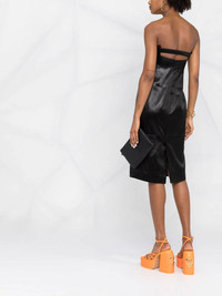 strapless mid-length dress from SAINT LAURENT featuring black, bow detailing, lace trim, rear slit, knee-length and rear zip fastening. Highlights - Black - Bow detailing - Lace trim - Rear slit - Knee-length - Rear zip fastening Made in Italy Composition lining: Silk 100% outer: Acetate 65%,Wool 26%,Silk 9%
