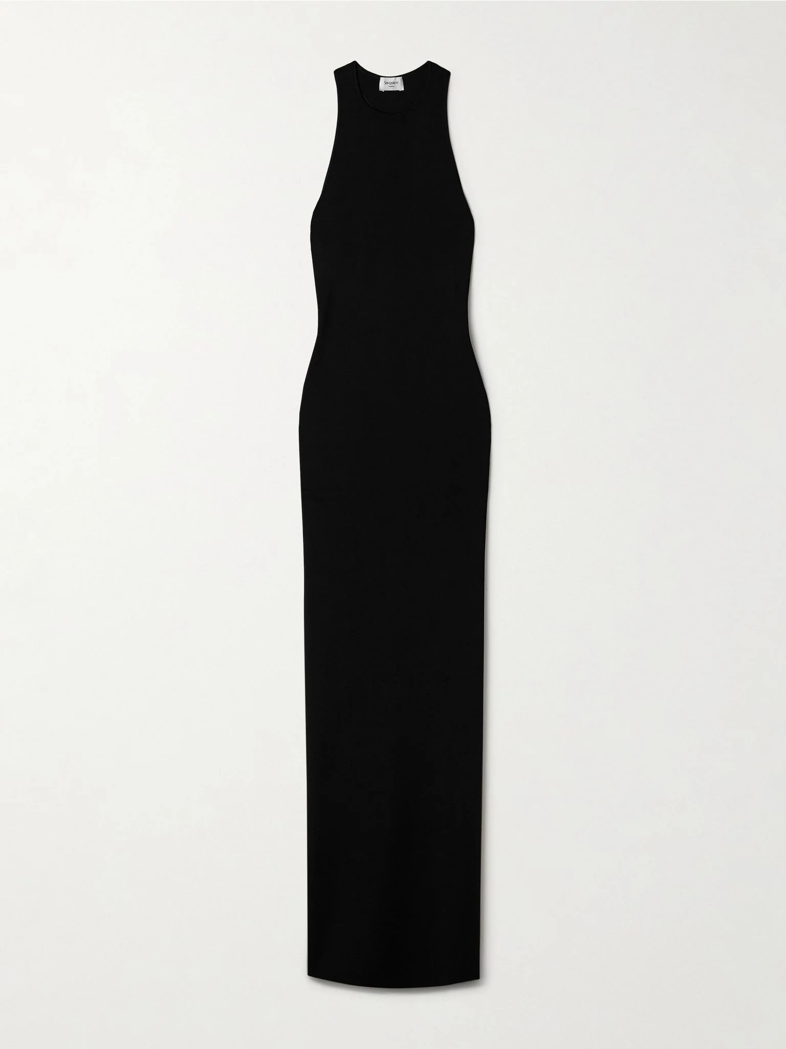 SAINT LAURENT's maxi dress has been made in Italy from stretch-knit that hugs your frame, beautifully accentuating each curve. It has a chic, minimal design with a high neckline and back split so you can move with ease. There's no limit to the amount of ways you can style it. Size & Fit - Fits true to size, take your normal size - Designed for a close fit - Lightweight, stretchy fabric - Model is 180cm/ 5'11" and is wearing a size Small Details & Care - Black stretch-knit - Slips on - 90% viscose, 8% polyamide, 2% elastane; trim: 80% viscose, 18% polyamide, 2% elastane - Dry clean