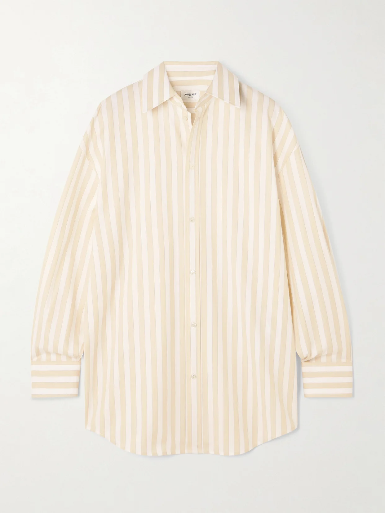 SAINT LAURENT's shirt is a timeless classic you'll be able to incorporate into countless outfits throughout the year. Made from cotton-pique in a neutral striped pattern, it has a slightly loose shape with dropped shoulder seams and a curved hem. The 'Cassandre' logo is subtly embroidered at the chest.