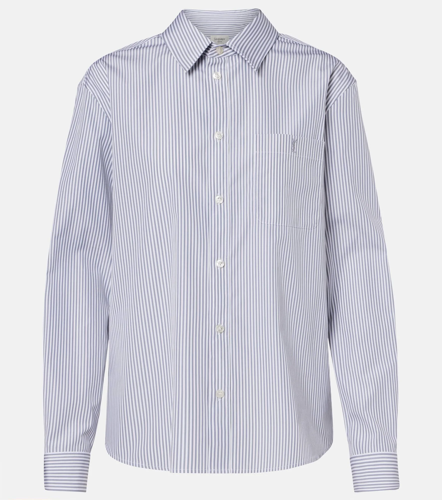 Since its conception in 1961, Saint Laurent has been coveted for its elegant Parisian aesthetic. This shirt is cut from cotton poplin and detailed with contrast stripes for a classic finish. Product Details - Material: 100% cotton - Care instructions: dry clean - Made in Italy - Designer color name: Blanc/Gris - Item color: white, gray - Collar: classic (Straight point) - Closure: buttoned front - Cuff: buttoned - Item number: P01135982 Size & Fit - True to size - Dropped shoulders - Straight fit - Non-stretchy fabric - Falls below the hip - The model seen in the picture is 178cm-5'10" and wearing a size FR 34
