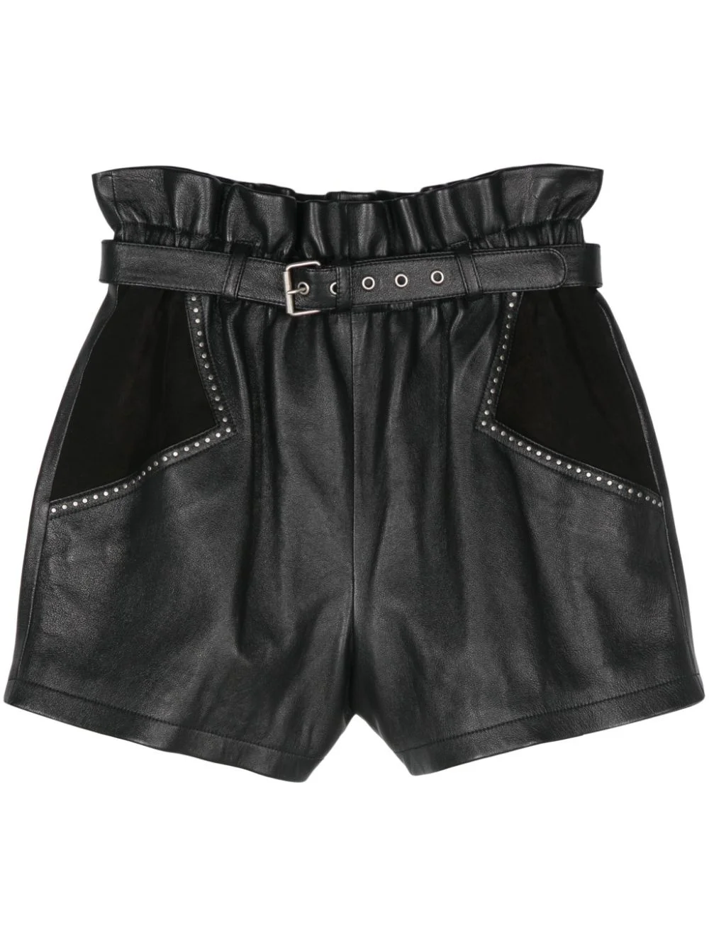 studded shorts Highlights - Black - Lambskin - Black - Leather - Silver-tone stud detailing - Paperbag waist - Elasticated waistband - Belt loops - Detachable waist belt - Slip pockets to the sides - Straight hem Made in Italy Composition Lining: Cotton 100% Outer: Calf Leather 100%, Lamb Skin 100%, Cupro 59%, Silk 41% SIZE & FIT FittingInformation This piece fits true to size. We recommend you get your regular size Cut for a slim fit Made with a mid-weight non-stretch fabric Washing instructions Dry Clean Only