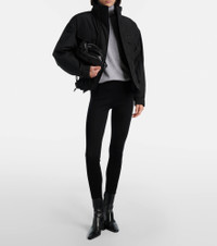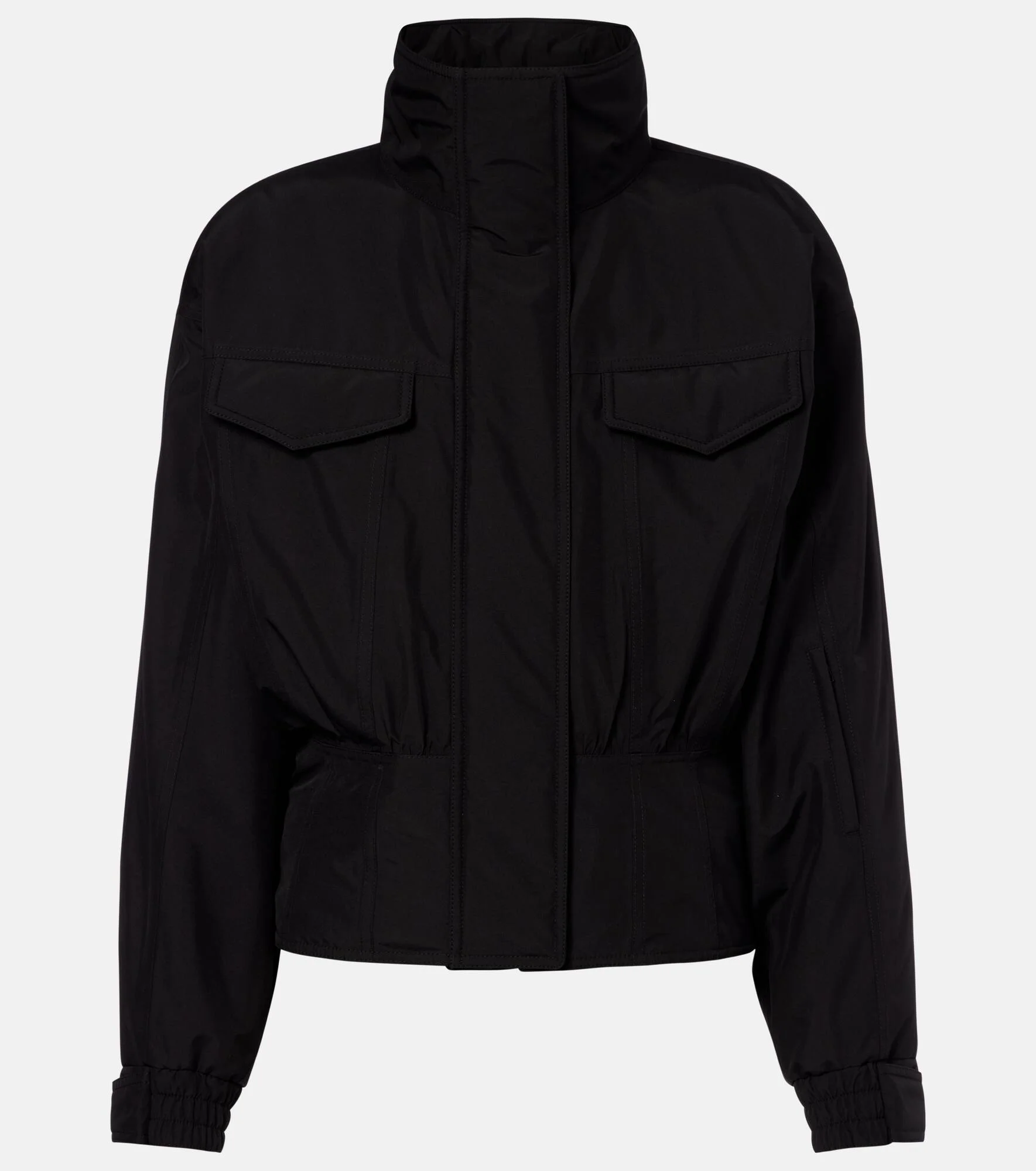 Since its conception in 1961, Saint Laurent has been coveted for its elegant Parisian aesthetic. Made from water-resistant canvas, this jacket is designed with a high neck, shoulder pads, and an elasticated band at the waist. Product Details - Material: 100% polyester - Care instructions: dry clean - Made in Italy - Color: black - Designer color name: Noir - Lining: 100% polyamide - Lining II: 80% polyamide, 20% elastane - Closure: zipper, snap-button fastenings - Shoulder pads - Cuff: buttoned, elasticated - Pockets: snap-buttoned pockets, zipped pockets, internal pockets - Detachable band - Drawstring at the hem for adjustable fit - Item number: P01164935 Size & Fit - True to size - Dropped shoulders - Cinched waist - Snow skirt inside - Non-stretchy fabric - Falls to the hip - Height of model is 175cm-69" and wears a size FR 34