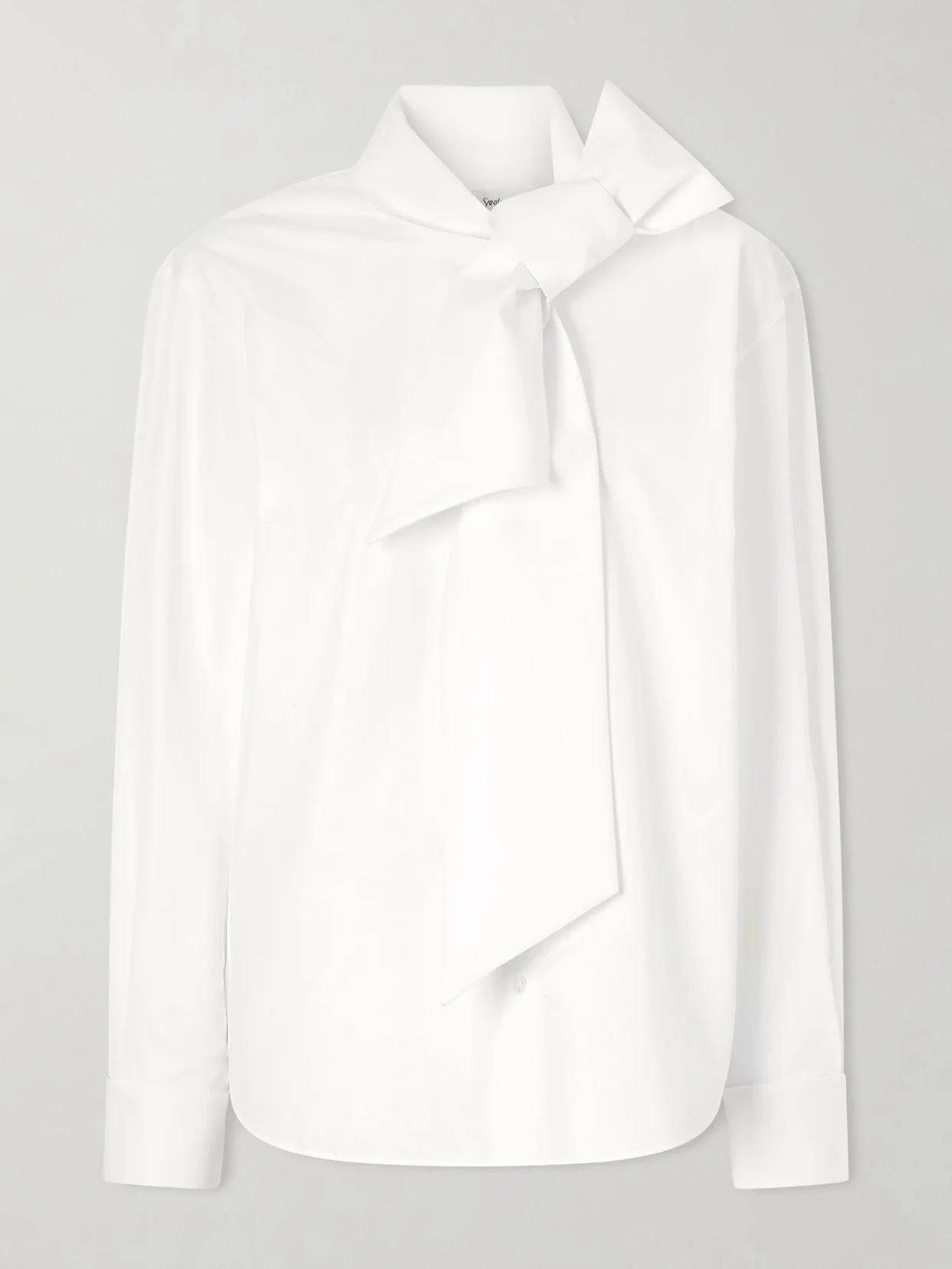 Beyond the decadence of the lavalliere collar, SAINT LAURENT's shirt is a study in technical excellence. Cut from crisp cotton-poplin, it's precisely tailored with structured shoulders, French cuffs and pleats through the back. Pair yours with denim, a leather skirt or pants.