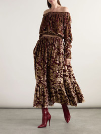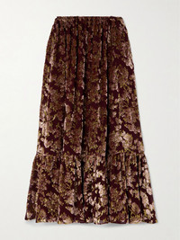 Tiered metallic devoré-velvet maxi skirt Burgundy