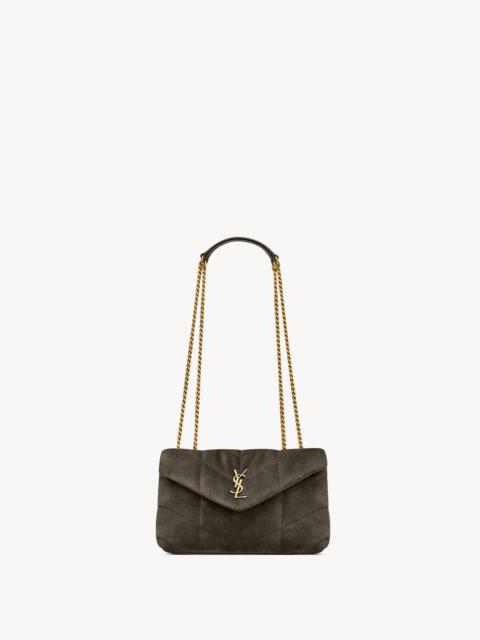 THE MINI VERSION OF THE ICONIC LOULOU PUFFER, IN SOFT SUEDE WITH CHEVRON-QUILTED TOPSTITCHING. THE BAG FEATURES A SLIDING CHAIN STRAP FOR SHOULDER OR CROSSBODY CARRY. - COTTON AND LEATHER LINING - BRONZE-TONE HARDWARE - MAGNETIC SNAP CLOSURE - ONE ZIP POCKET - TWO CARD SLOTS - DIMENSIONS: 22.5 X 16 X 8 CM / 8.9" X 6.3" X 3.1" - SINGLE-STRAP DROP: 55 CM / 21.7" - DOUBLE-STRAP DROP: 29 CM / 11.4" - CALFSKIN LEATHER, METAL - STYLE ID 7593371U8073212 - MADE IN ITALY