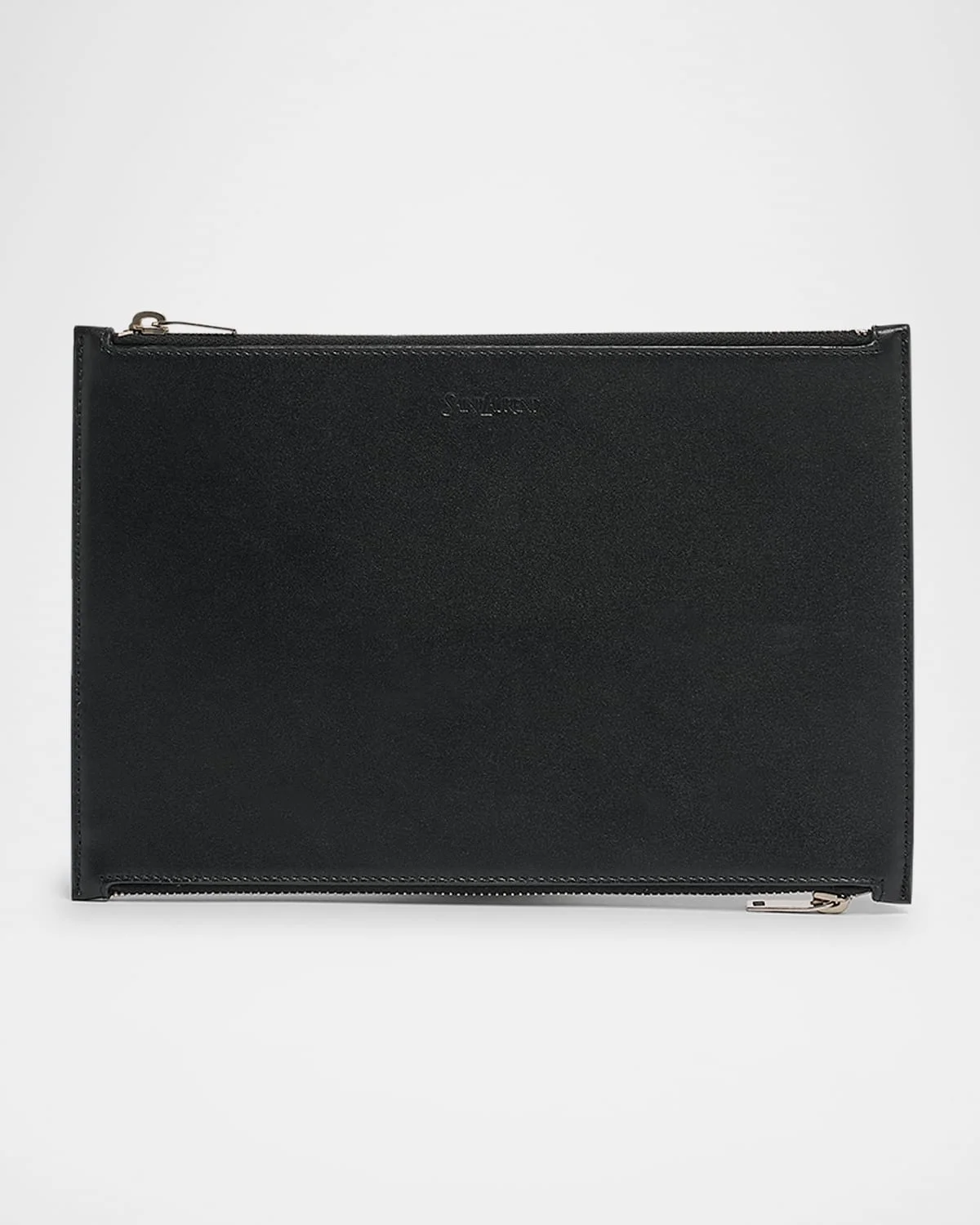 - Saint Laurent travel pouch bag in leather - Double sided zip top closures - Exterior, back zip pocket - Silver hardware - Approx. 6"H x 8.5"W x 0.3"D - Professional cleaning recommended - Made in Italy