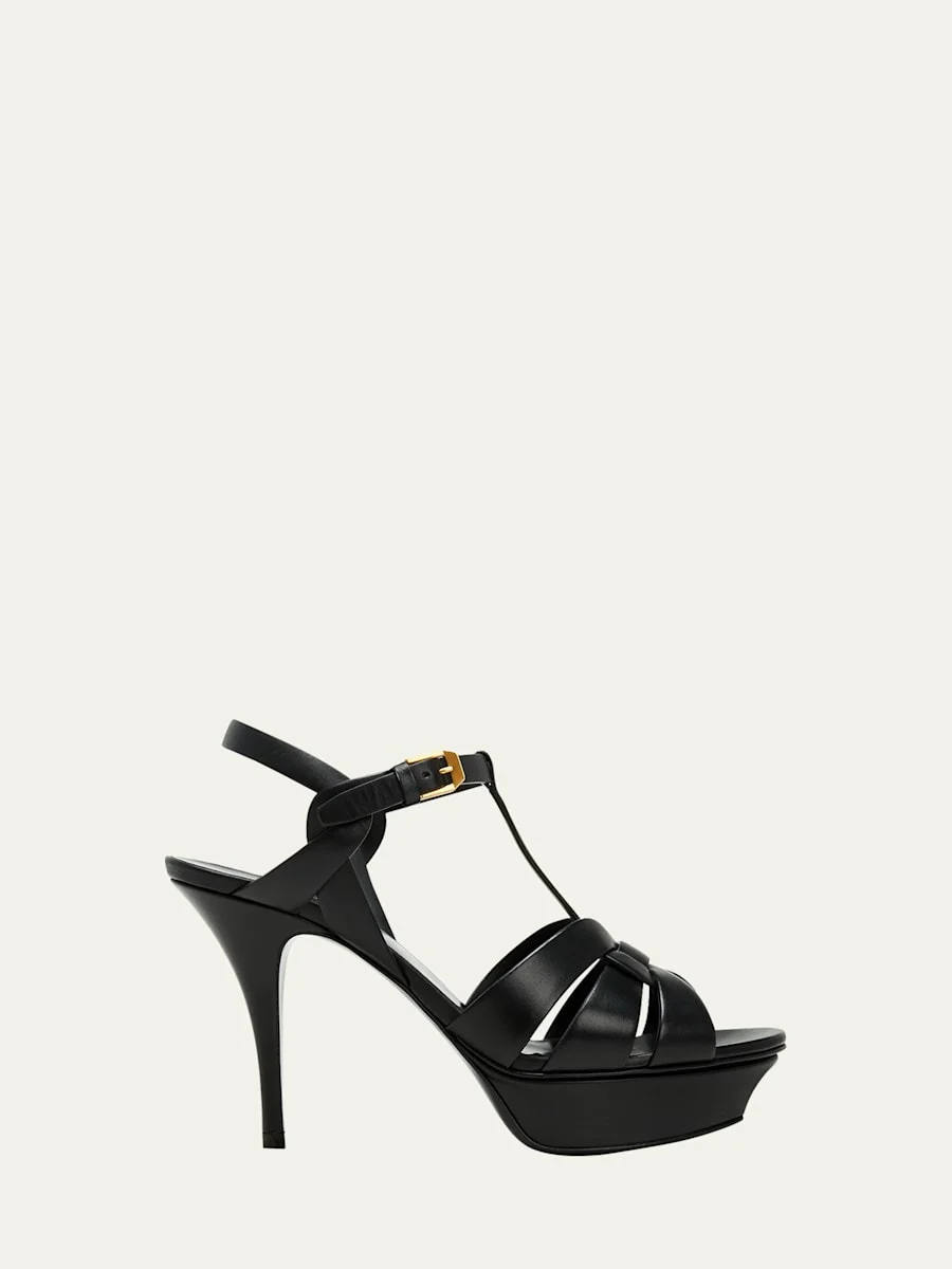 Composed from wide straps of interwoven leather, Saint Laurent's Tribute platform sandals are a timeless way to boost your confidence – and your height. Their T-bar front and oversized platform ensure they exude a 1970s-meets-modern-day aura, no matter what you pair them with. Saint Laurent leather sandal. Approx. 3" covered stiletto heel; 1.2" platform; 1.8" equiv. Tapered straps band open toe. T-strap vamp. Adjustable ankle strap. Leather lining and sole. Made in Italy Online Inquiries: BGS21_X3VN7| Store Inquiries: #2180928