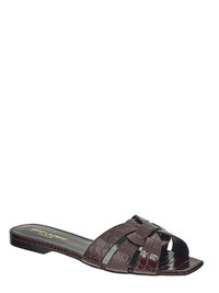 Saint Laurent slides in barolo leather with embossed crocodile effect. The item is featured by flat sole, braided straps and branded footbed. MORE INFORMATION Gender: Woman Color: burgundy Patterns: animal print Manufacturer Code: 57276106A006031 Descriptive Color: barolo Composition: 100% LEATHER Made In: Italy Heel Height: low_heel Brand: Saint Laurent Season Code: SS23 Measures: Heel: 1 cm Size Label: IT