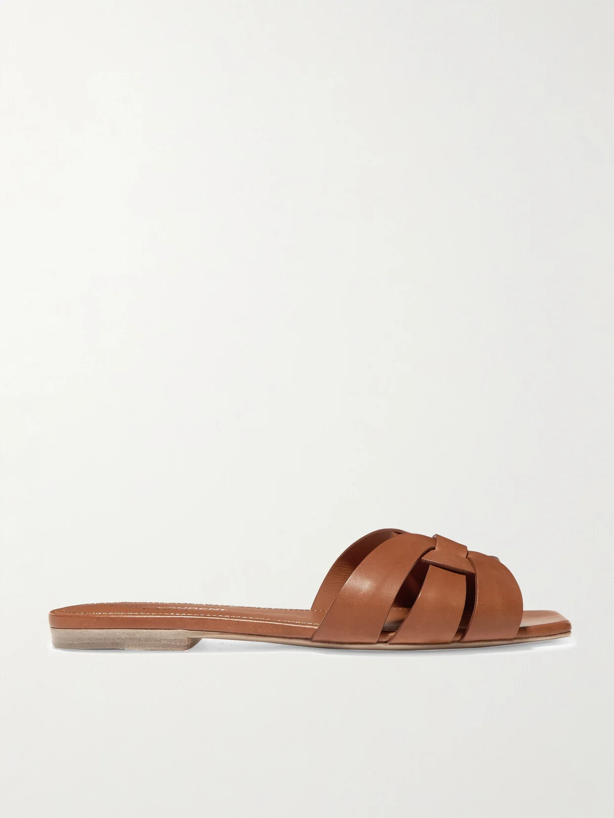 SAINT LAURENT's 'Tribute' slides are equally versatile and comfortable. Perfect for vacations or walking around the city, they're made from soft leather and have square toes and slight heels. The tan color will work with everything from bright prints to neutrals.