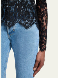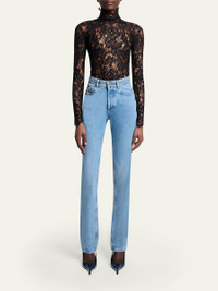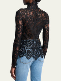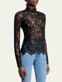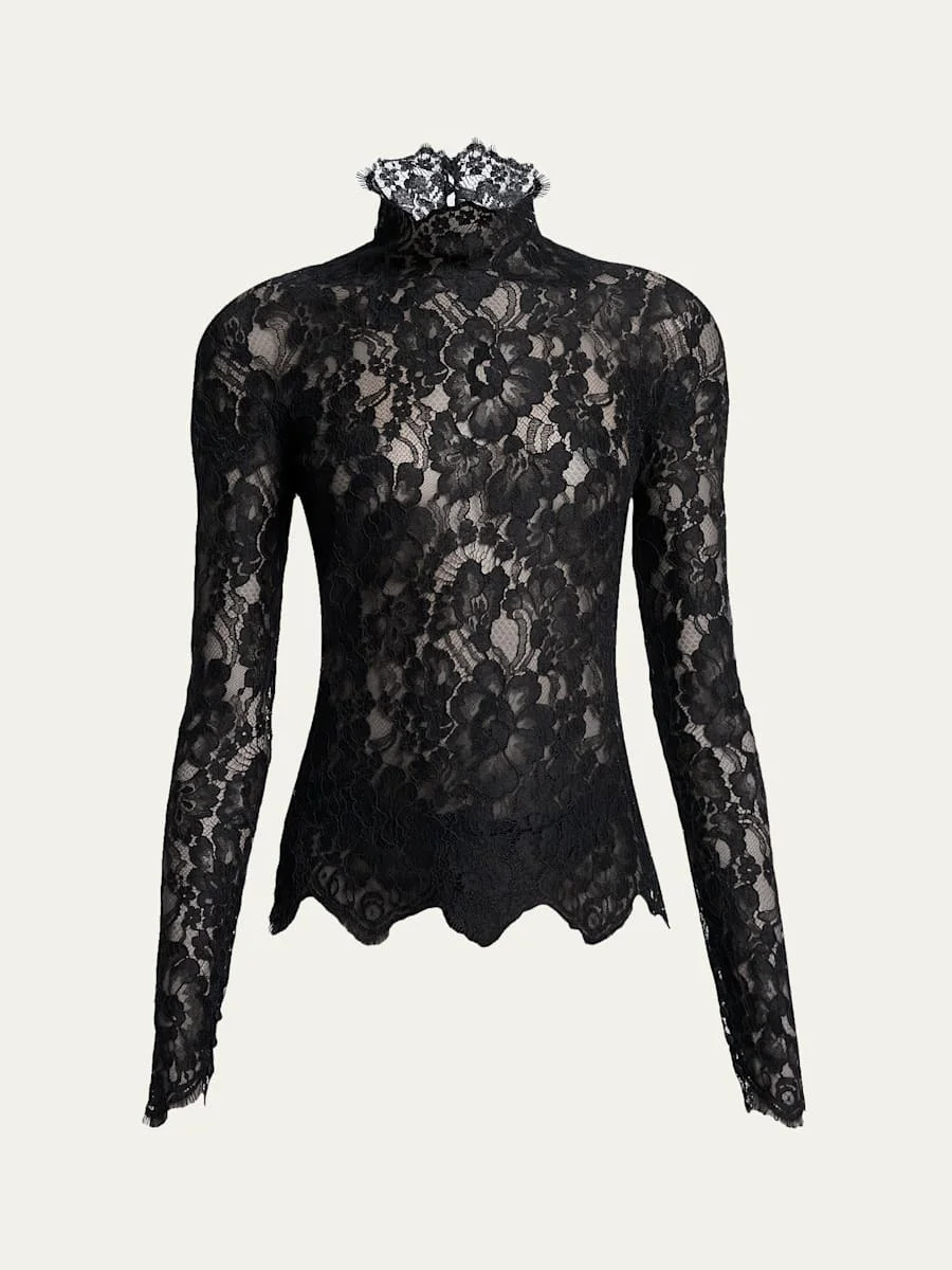 Saint Laurent top is crafted of a sheer lace with scalloped edges Turtleneck Long sleeves Fitted Button back closure Cotton/viscose/nylon/polyamide Made in Italy Online Inquiries: BGS21_BB0RN| Store Inquiries: #5404433