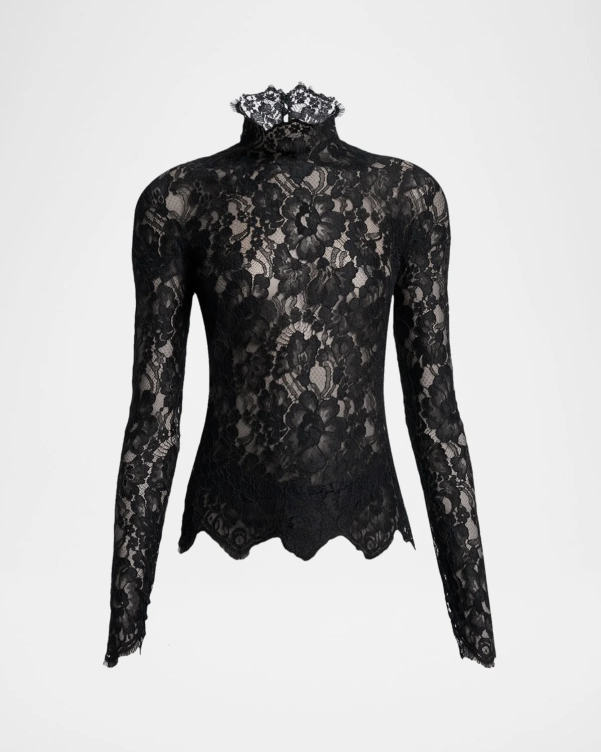 Saint Laurent top is crafted of a sheer lace with scalloped edges Turtleneck Long sleeves Fitted Button back closure Cotton/viscose/nylon/polyamide Made in Italy