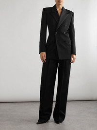A reinterpretation of traditional tuxedo jackets, SAINT LAURENT's double-breasted blazer is designed with a nipped-in waist balanced by angular, structured shoulders. It's made from grain de poudre wool and has twill-trimmed peak lapels and covered buttons, including at the cuffs. Size & Fit - Fits small to size, take one size larger than normal - Tailored for a slim fit - Internal shoulder pads - Mid-weight, non-stretchy fabric - Model is 177cm/ 5'10", normally wears a FR 36 and is wearing a FR 38 Details & Care - Black grain de poudre wool and twill - Button fastenings through double-breasted front - 100% wool; trim: 100% polyester; lining: 100% silk