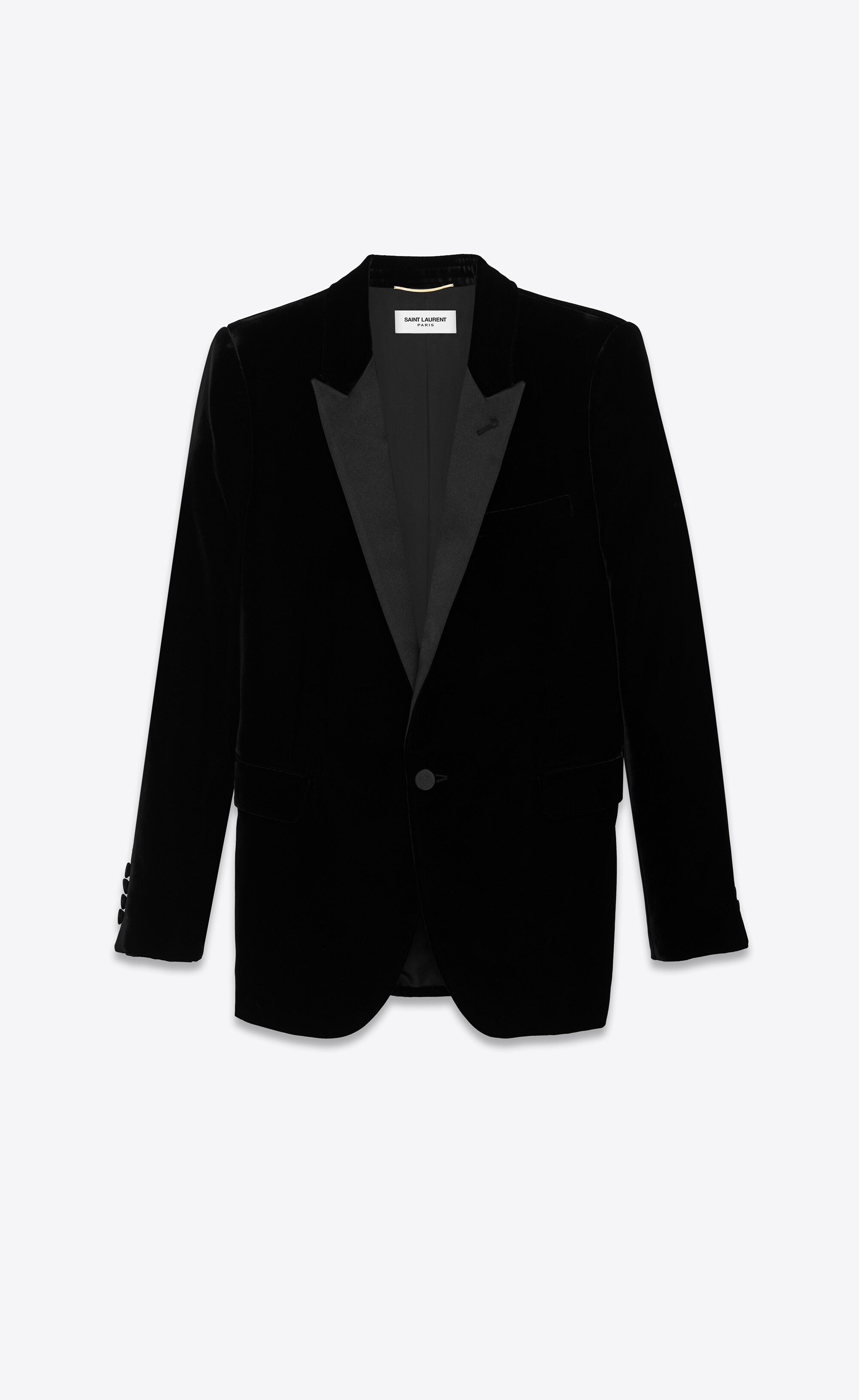 SAINT LAURENT TUXEDO JACKET WITH PEAK LAPEL, FLAP POCKETS AND WELT BREAST POCKET. - 65% VISCOSE, 35% CUPRO - 1 BUTTON CLOSURE - SINGLE VENTED BACK - 2 INTERIOR POCKETS - BUTTONED CUFFS - STYLE ID 809398399 - MADE IN ITALY