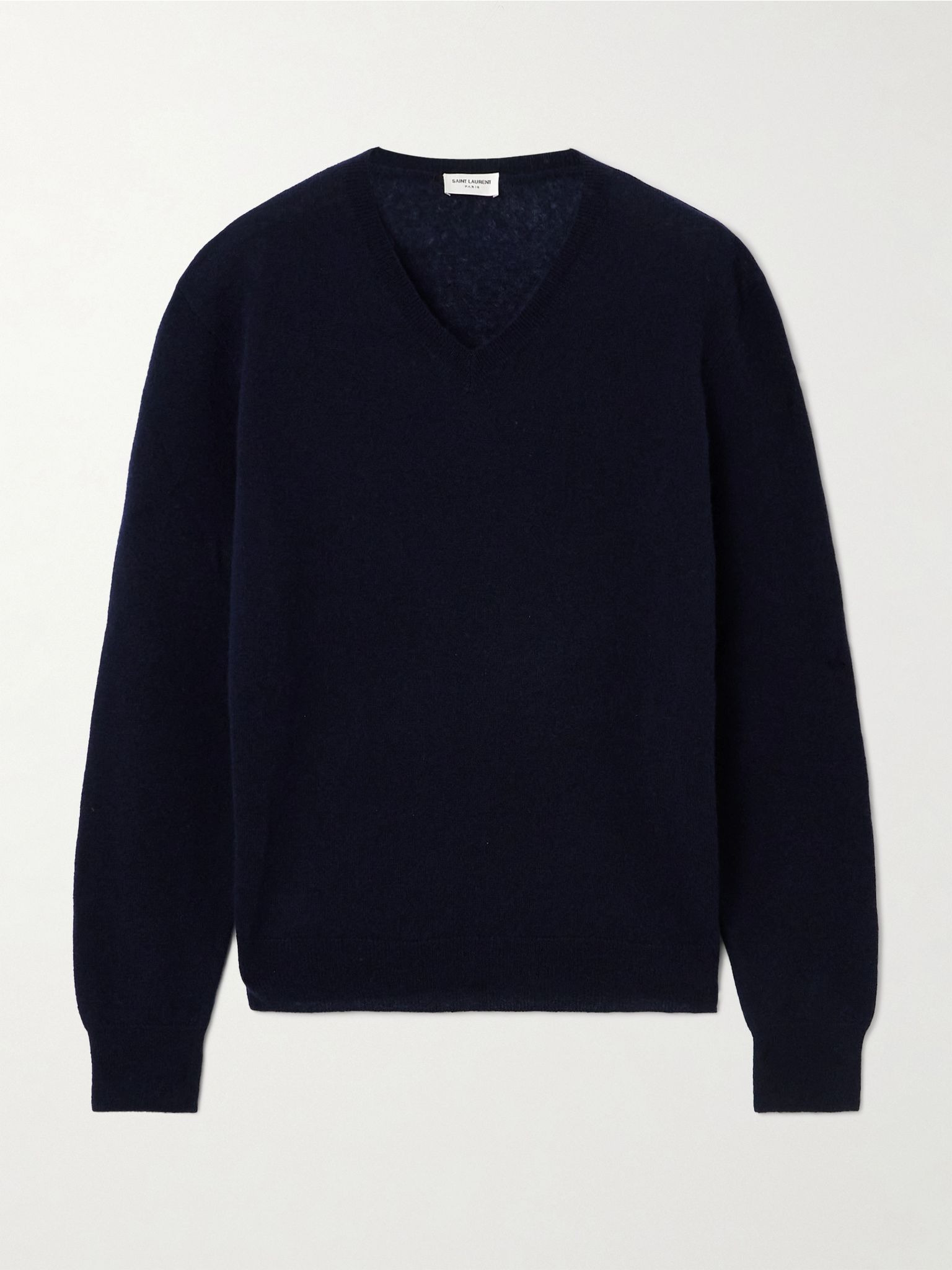 SAINT LAURENT's sweater is knitted from a blend of cashmere and silk that feels irresistibly soft against bare skin and has a classic V-neck. Wear yours tucked into a pair of high-rise pants. Size & Fit - Fits true to size, take your normal size - Designed for a slightly loose fit - Mid-weight knit - Model is 177cm/ 5'10" and is wearing a size Small Details & Care - Midnight-blue cashmere and silk-blend - Slips on - 60% cashmere, 40% silk - Hand wash