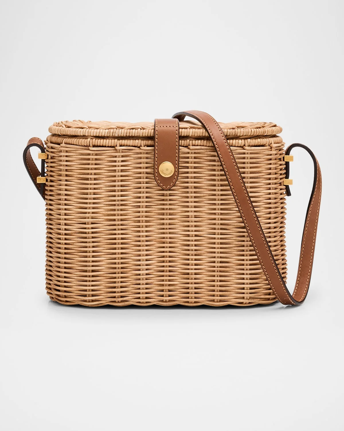 - Saint Laurent vanity crossbody bag in bamboo wicker with leather details - Adjustable leather crossbody bag - Flap top with snap closure - Interior, one slip pocket - Approx. 4.7"H x 7.2"W x 3.1"D - Made in France