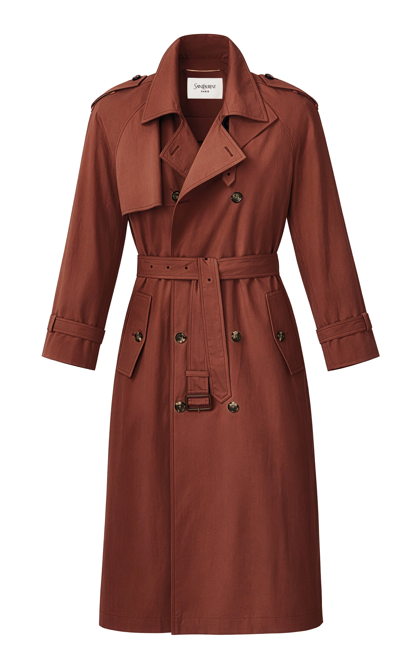 The French luxury house was founded in 1961 by Yves Saint Laurent and his partner, Pierre Berge. Today, creative director Anthony Vaccarello honors its legacy with a timeless (or hors du temps) offering. This oversized double-breasted belted trench coat has a three-way ulster collar and adjustable throat latch, featuring a storm flap, buttoned epaulets, and strapped cuffs. PRODUCT DETAILS - Resort '26 - Button fastening - Composition: 89% cotton, 11% silk - Designer color: Mocha - Dry clean - Made in Italy