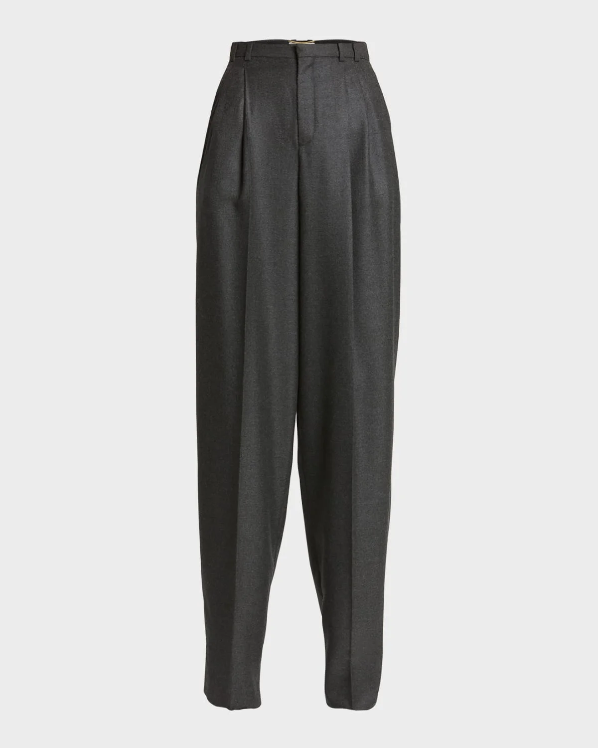 Saint Laurent wideleg tailored pants feature pleating at the waist High rise Button/zip fly; belt loops Side slip pockets; back welt pockets Full length Relaxed fit Cashmere/cotton/elastane Made in Italy
