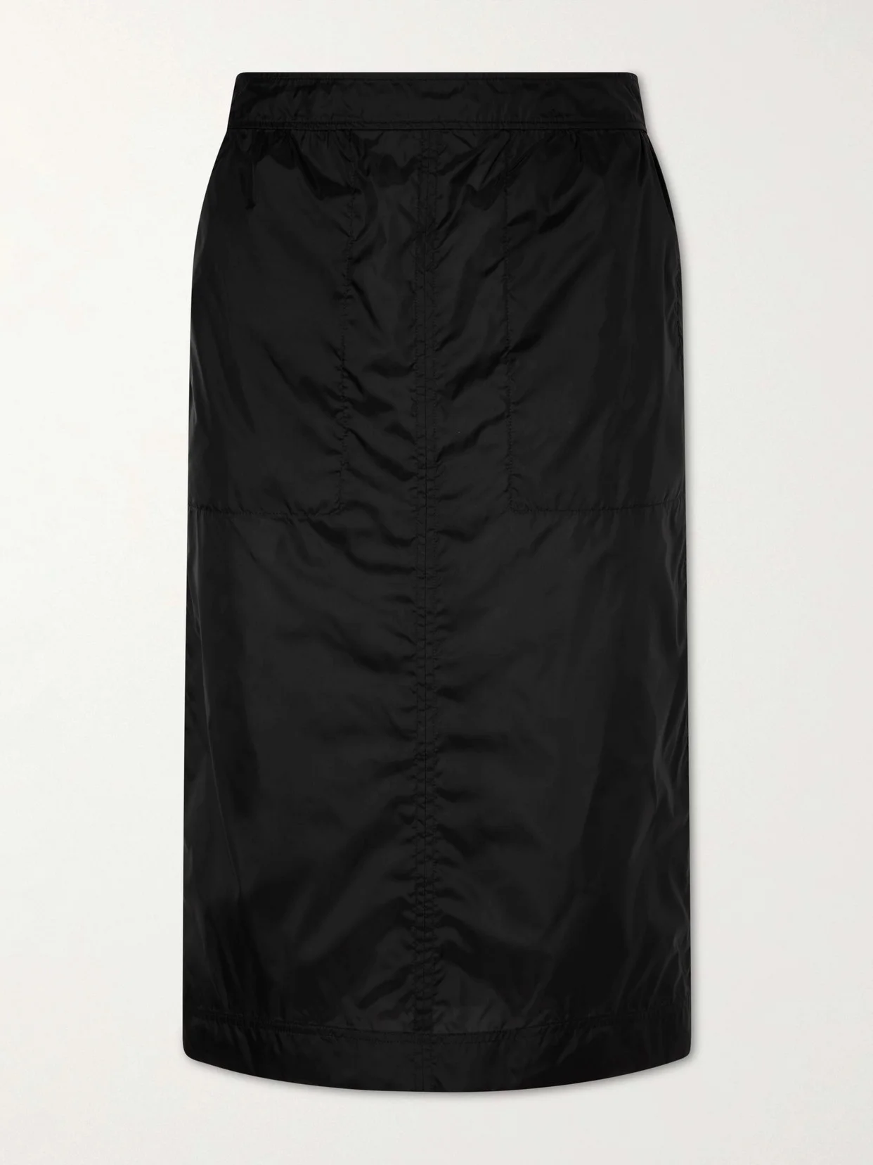 SAINT LAURENT's parachute skirt channels the house's dialogue between utility and seduction. Seen on the runway, it is cut from lightweight technical toile into an elongated silhouette with subtle gathering for movement. A refined yet subversive study in tension.