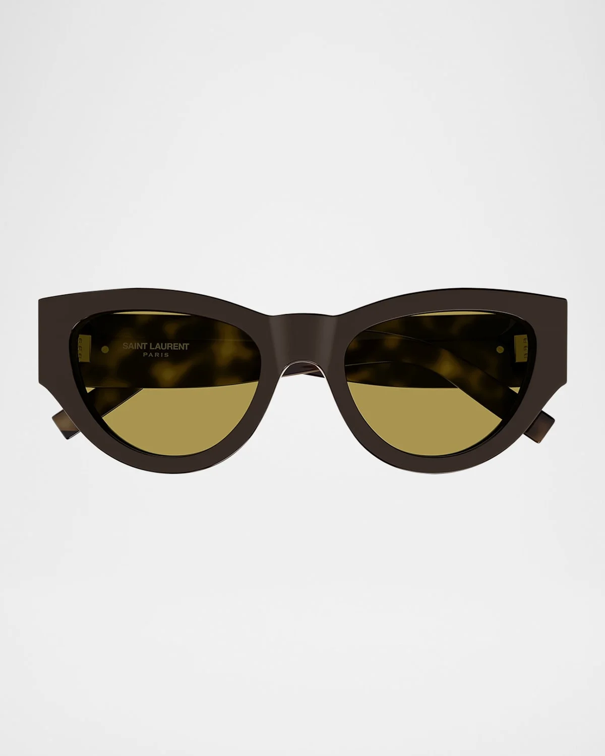 - A strong feminine cat eye shape, the evolution of the monogram acetate In a bolder and new iconic version The mythic ysl signature is integrated as an hinge detail and made highly Visible on both bold temples - Saint Laurent Acetate rnd sngls - Eye/bridge/temple (in mm): 53-20-145 - Eyewear style: Cat Eye - Acetate - 100% UVA/UVB protection - Made in Italy - Proposition 65 warning for California residents