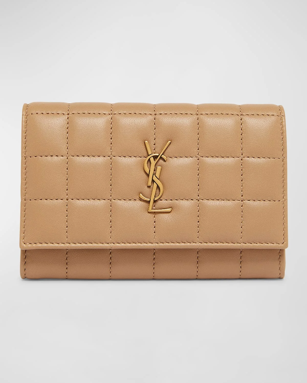 - Saint Laurent wallet in quilted lambskin leather - Bronze YSL monogram hardware - Flap top with snap closure - Approx. 3.7"H x 5.1"W x 0.8"D - Made in Italy