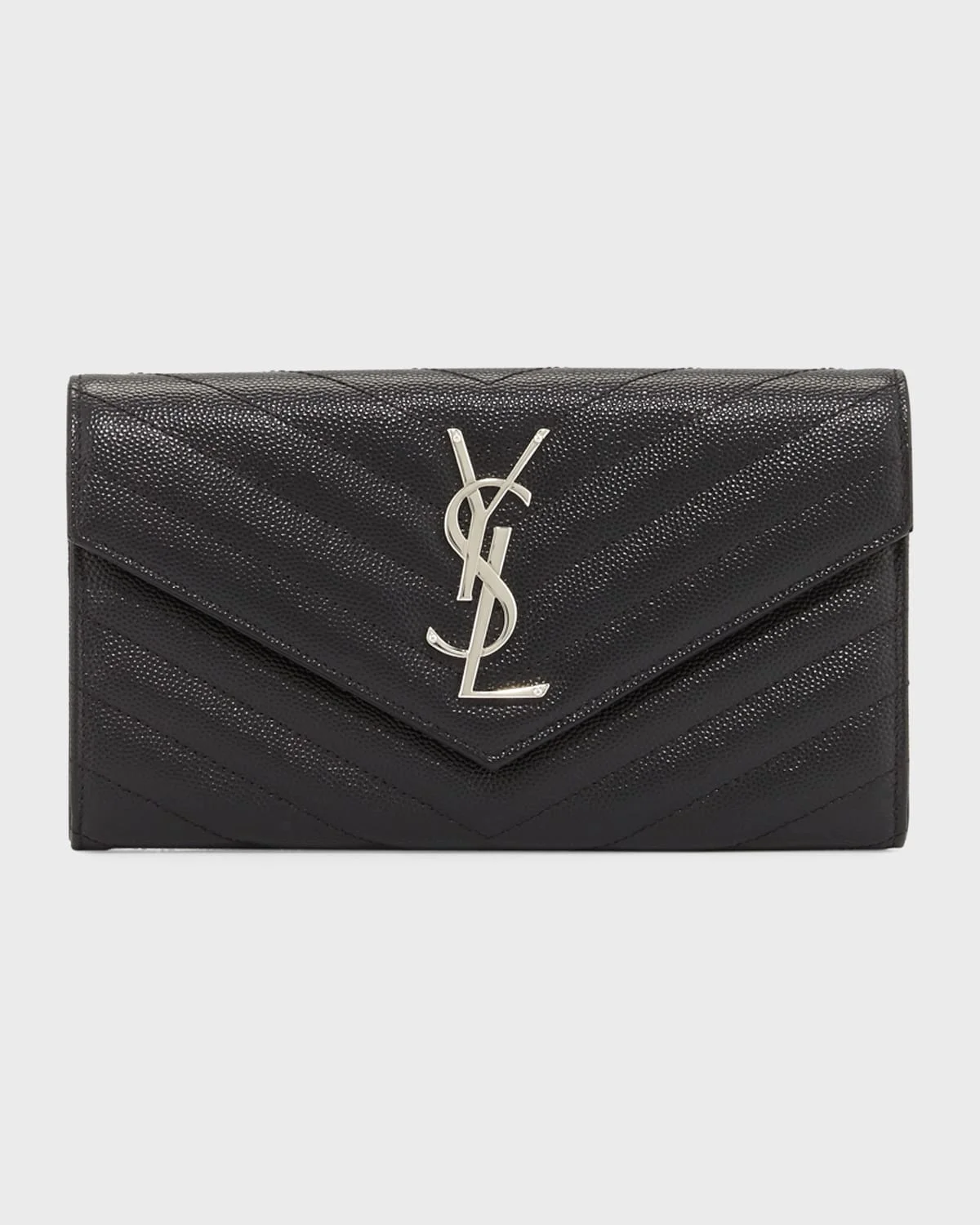 Saint Laurent continental wallet in powdergrain calf leather with chevron topstitching Silvertone YSL logo lettering on front Envelope flap top with snap closure Zip compartment divides the interior Silvertone hardware Interior, leather lining; two bill and 12 card slots Approx. 4.3"H x 7.5"W x 1.2"D Made in Italy
