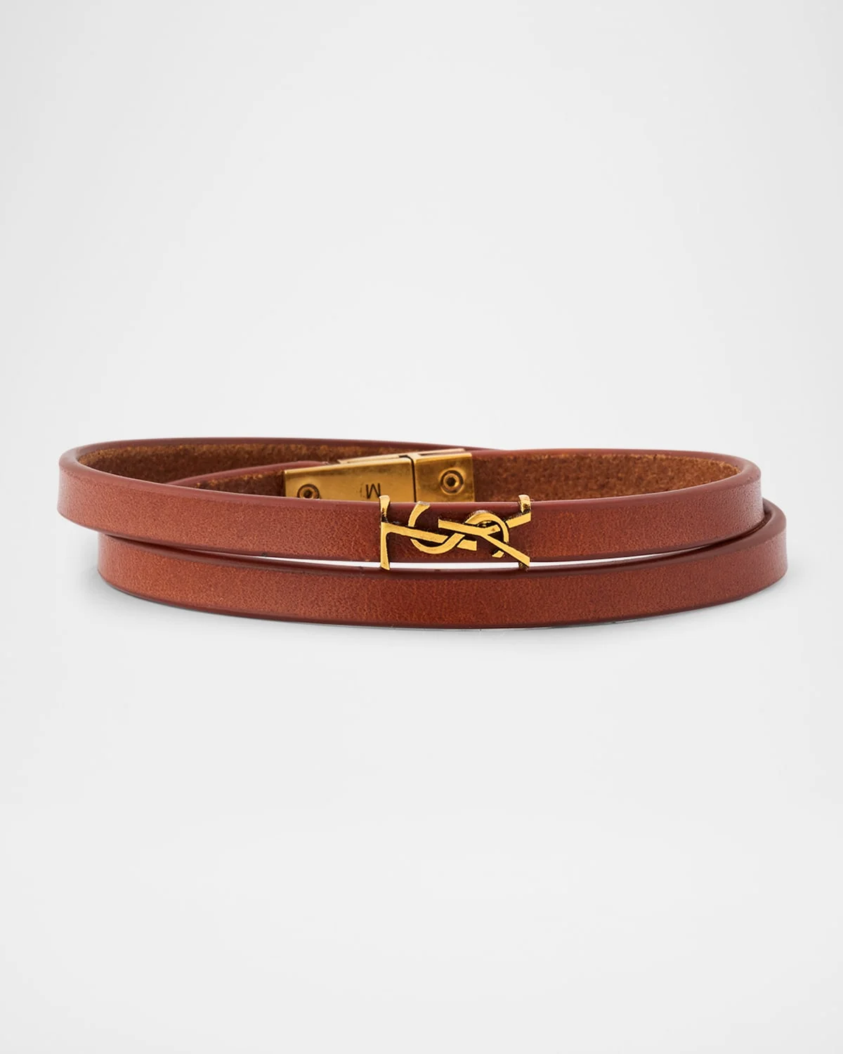 The iconic Saint Laurent YSL logo shines on this doublewrap bracelet crafted from genuine leather that is sealed with a magnetic sliding clasp. Approx. 0.2" x 0.8" logo station Goldtone hardware Wraparound style with magnetic closure Made in Italy