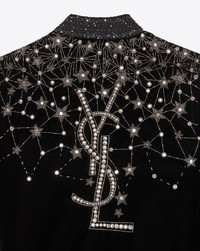 VARSITY JACKET DECORATED WITH EMBROIDERED STARS AND MIRRORS ON FRONT AND BACK, ALONG WITH A YSL LOGO ON BACK. - 65% VISCOSE, 35% CUPRO - CUPRO AND COTTON LINING - SNAP CLOSURE - SNAP BUTTON CLOSURE - TWO FRONT POCKETS - ONE INTERIOR POCKET - RIBBED COLLAR AND WAISTBAND SET WITH SEQUINS AND LUREX - STYLE ID 579965Y525R1000 - MADE IN ITALY